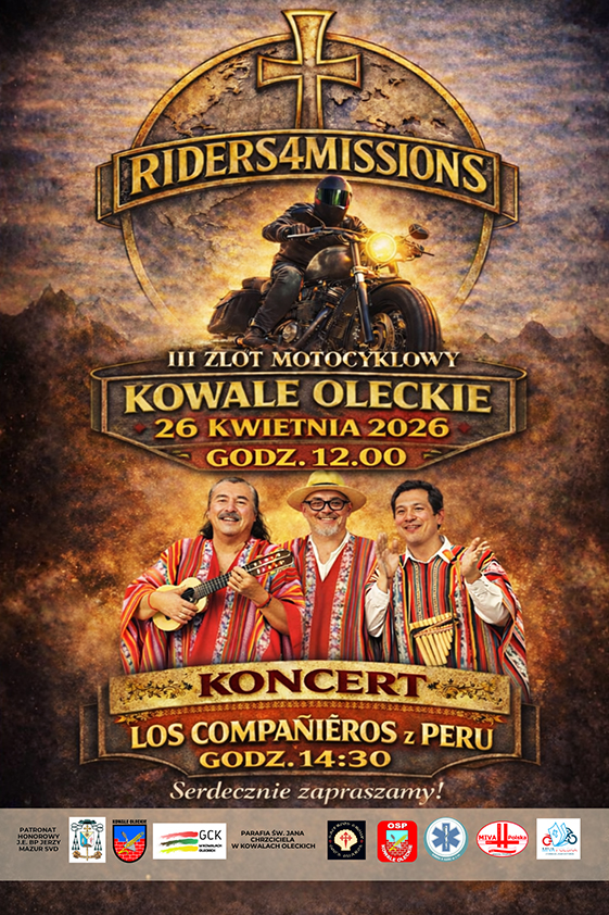 W ramach obchodów Niedzieli Modlitw za Kierowców, 26 kwietnia w Kowalach Oleckich na Mazurach, odbędzie się również III Zlot Motocyklowy „Riders 4 Missions”. O godz. 12.00, w kościele św. Jana Chrzciciela, ks. Jerzy Kraśnicki, dyrektor MIVA Polska i zastępca krajowego duszpasterza kierowców, będzie sprawował Mszę św. Po niej, o godz. 13.15, zaplanowano paradę motocyklową, a następnie piknik i występ peruwiańskiego zespołu „Los Companieros”.
