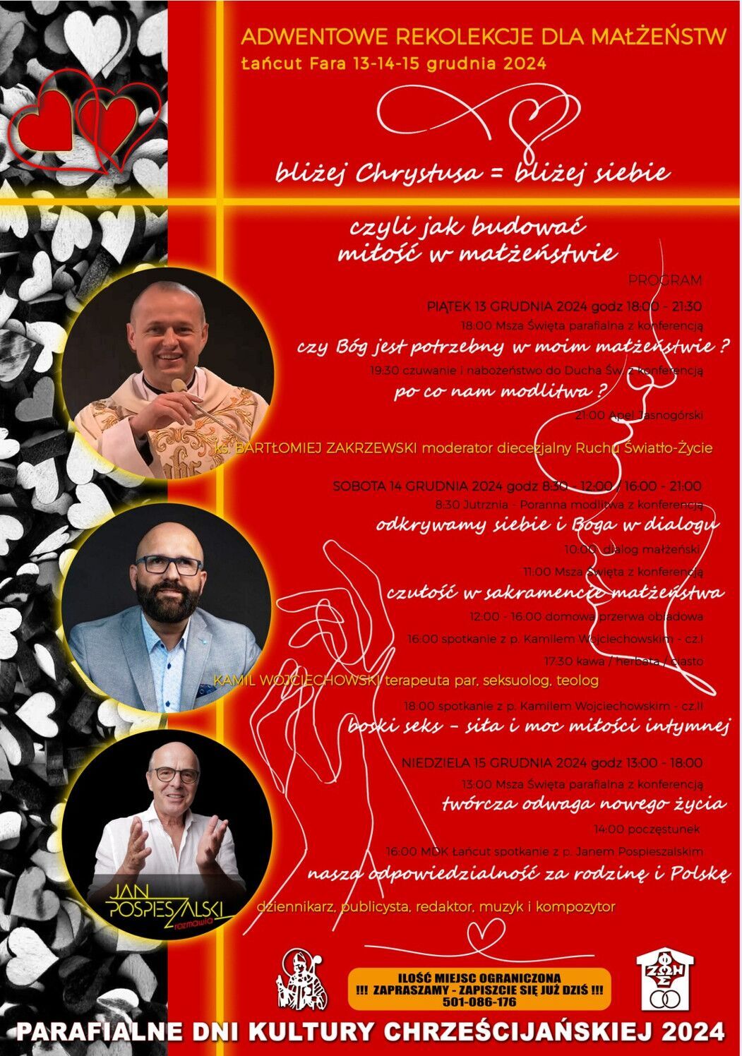 Niedziela, 15 grudnia 2024 r., to wspólna Msza Święta o godz. 13.00 z konferencją ks. Bartłomieja Zakrzewskiego. A od godz. 16.00 w Miejskim Domu Kultury spotkanie z Panem Janem Pospieszalskim. Temat rodziny, małżeństwa i jej roli we współczesnym świecie poruszymy podczas niedzielnego spotkania i rozmowy.