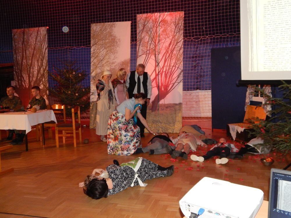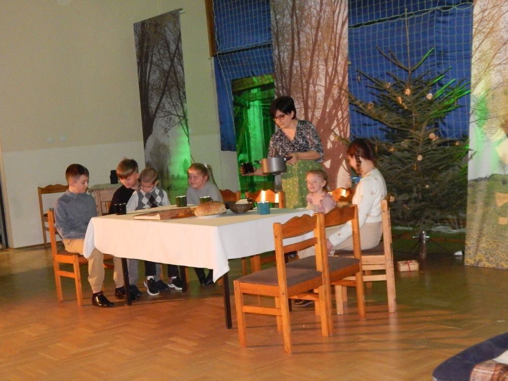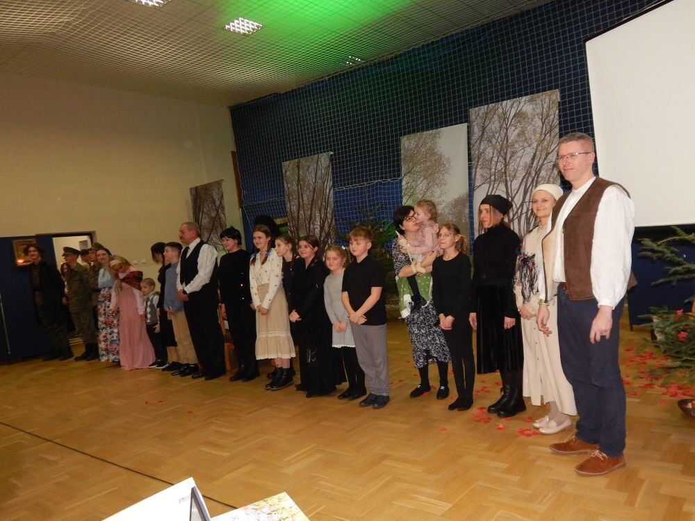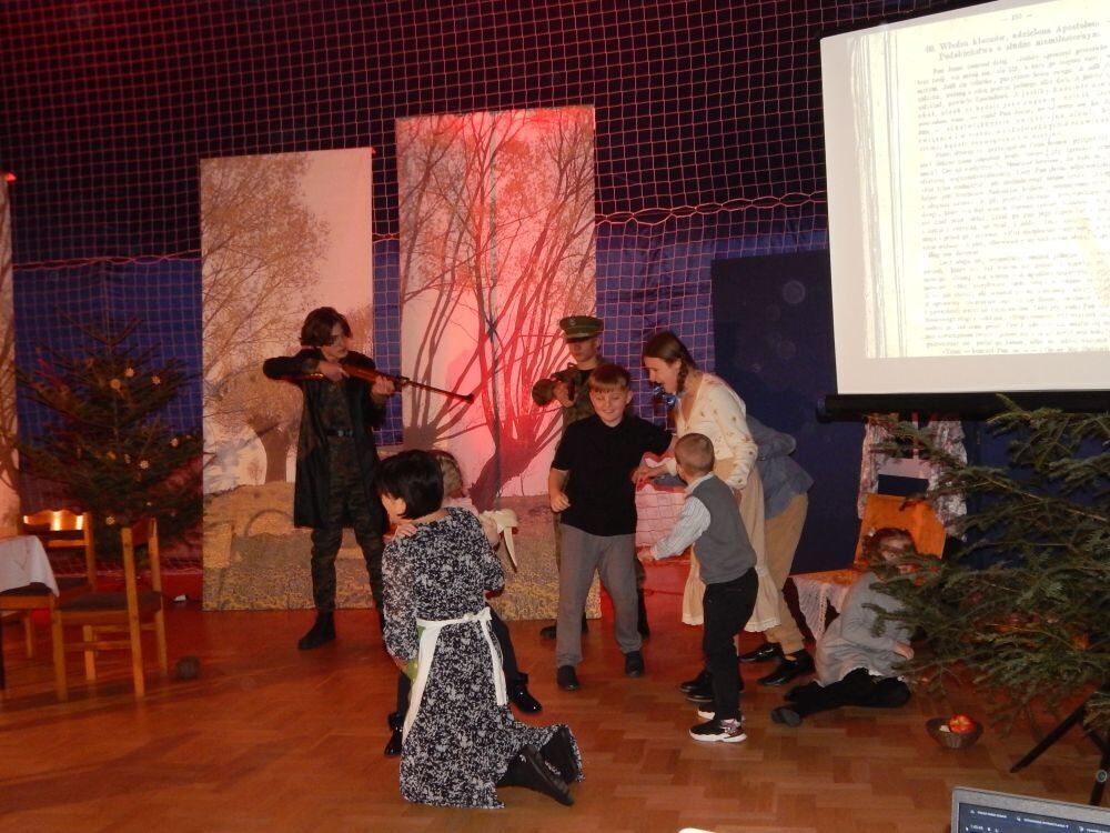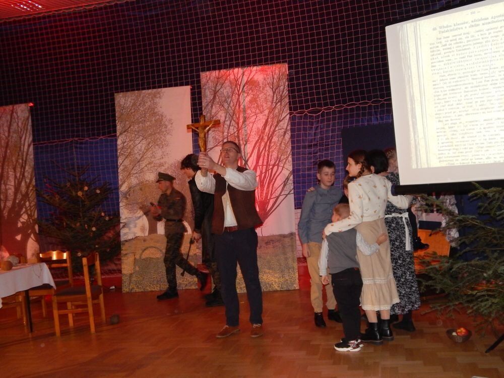 Prowadzący, zaprosili wszystkich uczestników na pierwsza część widowiska związaną z wigilijną wieczerzą, uzupełnianą spontanicznym wspólnym kolędowaniem. W kolejnej części miał miejsce spektakl o losach rodziny Ulmów z Markowej – w formie pantomimy, z narracją obejmującą fragmenty Pisma Świętego. Niespodzianie słowa aktorów, zastąpiły ich trafna mimika, przejmujący ruch, sugestywna gestykulacja, co w połączeniu z doskonałą scenografią i przejmującą grą świateł, podkładem muzycznym stworzyło doskonałe widowisko. O skali przeżywanych emocji przez wszystkich na widowni, zaświadczyły skrywane i jawne łzy, niespodziewana pauza tuż po zakończeniu spektaklu przechodząca w długie owacje wszystkich widzów na stojąco dla wszystkich aktorów. Wszyscy razem i każdy z osobna przekonali się jak wiele i jak trafnie można „powiedzieć” bez używania słów – to darowane doświadczenie pozostanie w świadomości na wiele lat.