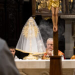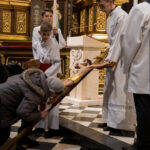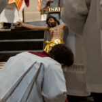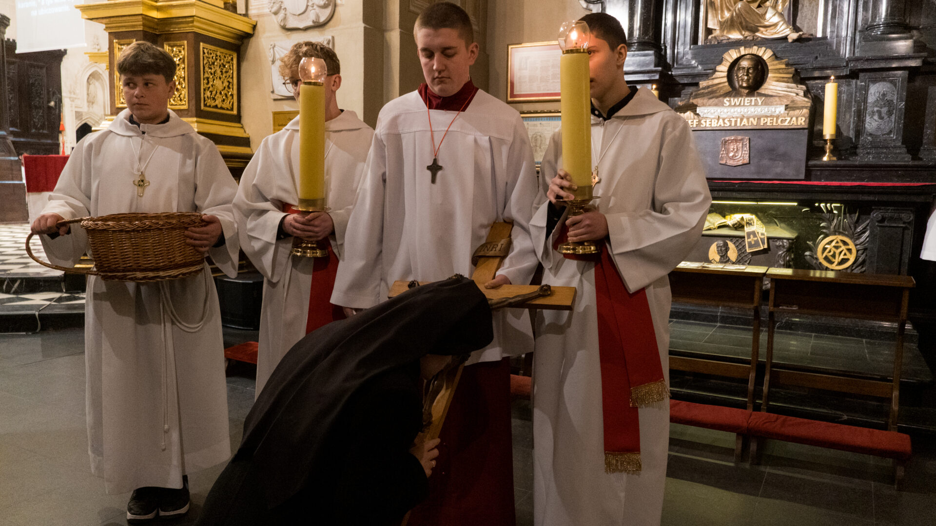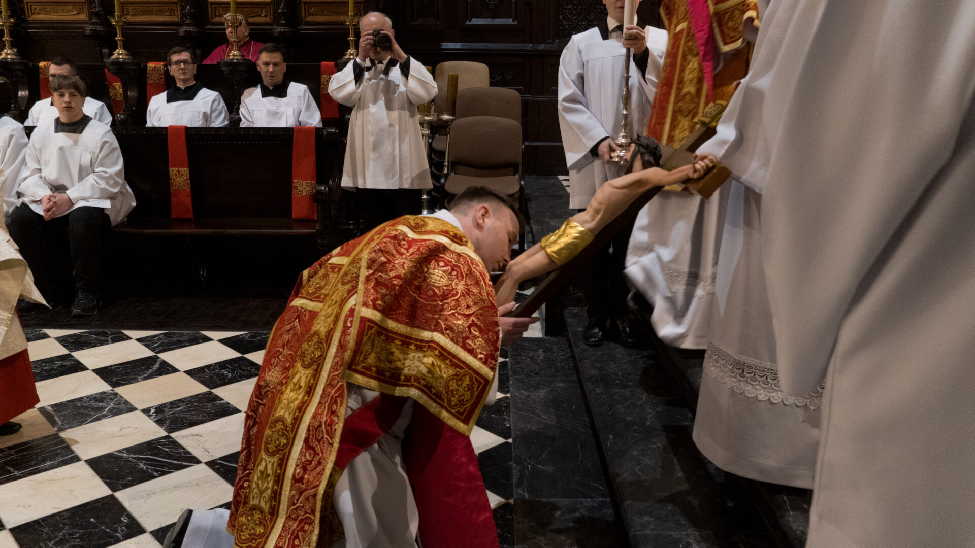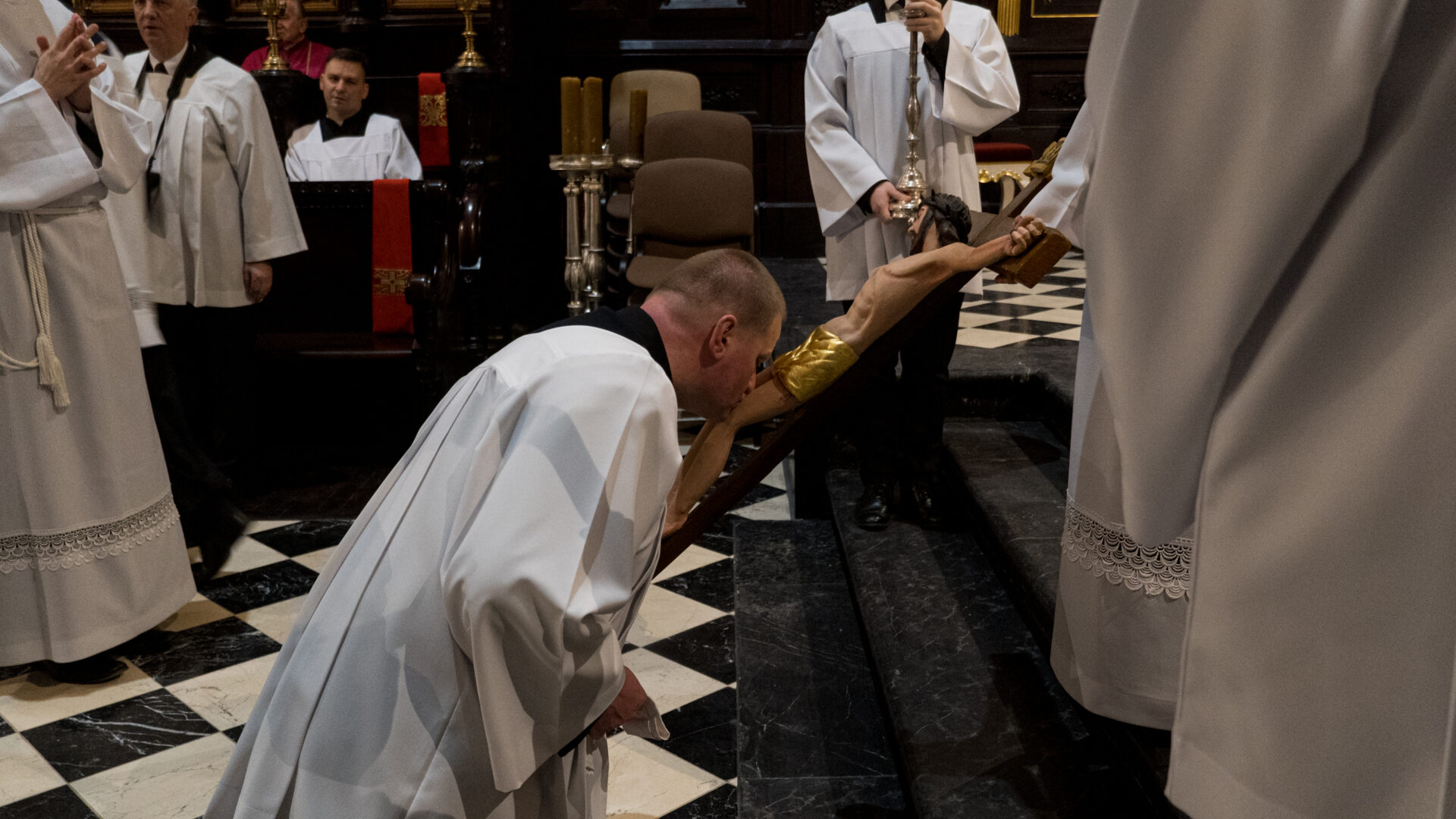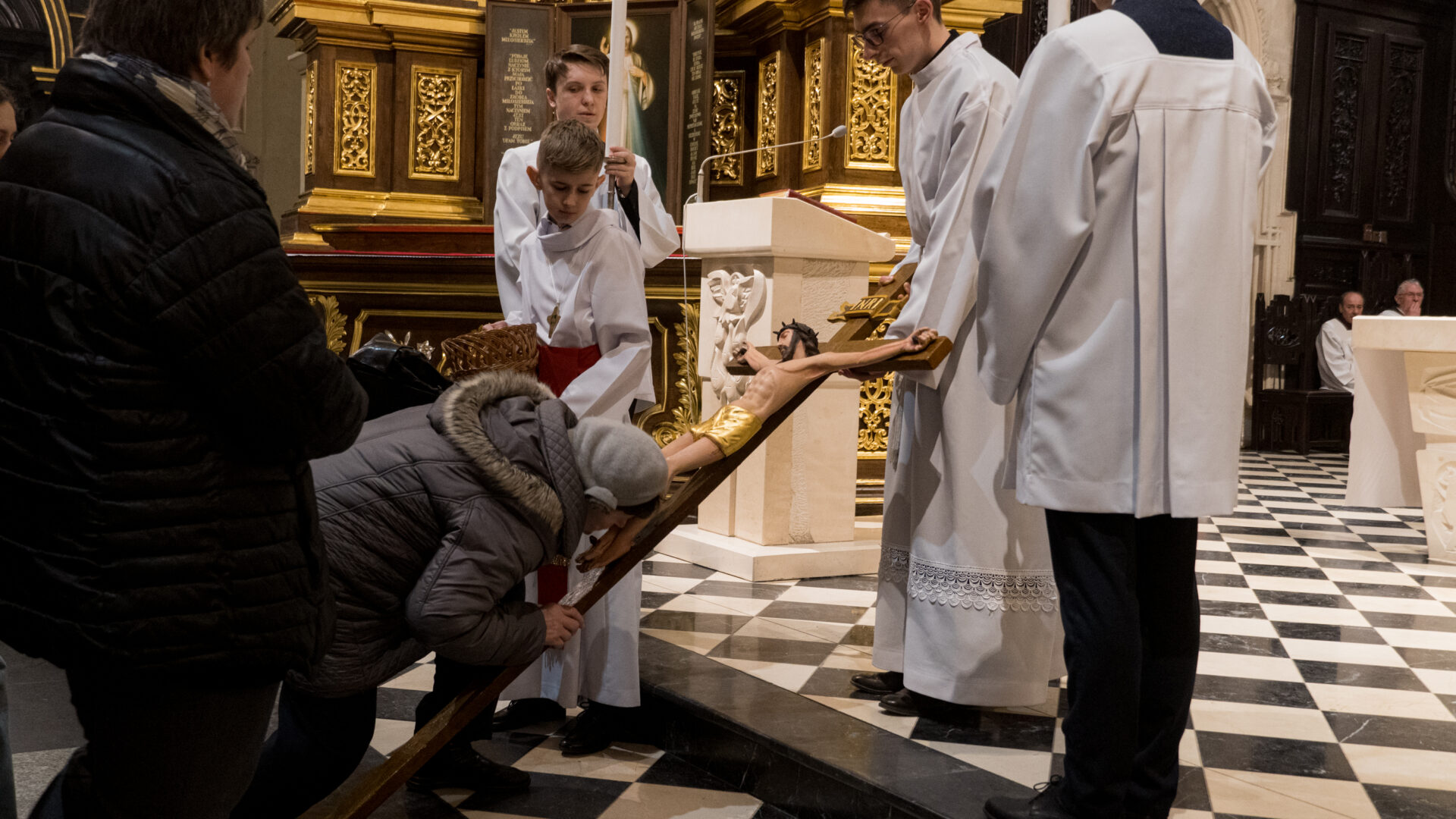 Słowo Boże pozwala nam spojrzeć z ufnością na nasze doświadczenia życiowe naznaczone cierpieniem, udrękami, lękami czy rozczarowaniem. To Słowo, które pozwala żywić nadzieję – zauważył bp Jamrozek i wyjaśniał czym jest wielowiekowa modlitwa powszechna. – Będziemy modlić się we wszystkich w potrzebach ludzkości, w tym trudnym momencie dziejów, w których też żyjemy. Modlitwa przypomni nam, że Jezus umarł za wszystkich – podkreślił, a następnie nawiązał do samej adoracji krzyża. – Bóg w Jezusie ukrzyżowanym otacza nas i pociesza, podtrzymuje i chroni, aby nikt nie zginął. Dlatego chcemy chronić się w cieniu jego skrzydeł. Oddając cześć krzyżowi, pozwólmy się pociągnąć naszemu Panu – zachęcał i przywołał scenę złożenia Jezusa w Grobie odnosząc ją do obrzędu komunii świętej. – Biorą na ręce Jego Ciało wydane za nas i dla naszego zbawienia. Ten gest nawiązuje do Eucharystii, kiedy my przyjmujemy Ciało Jezusa w komunii świętej. Pragniemy je złożyć w naszym sercu i prosić, aby Pan nas odnawiał i upodabniał do siebie – zaznaczył. – W ten sposób dzisiejsza celebracja objawia nam sens Męki Jezusa, ale też i piękno naszego Zbawiciela – dodał.
