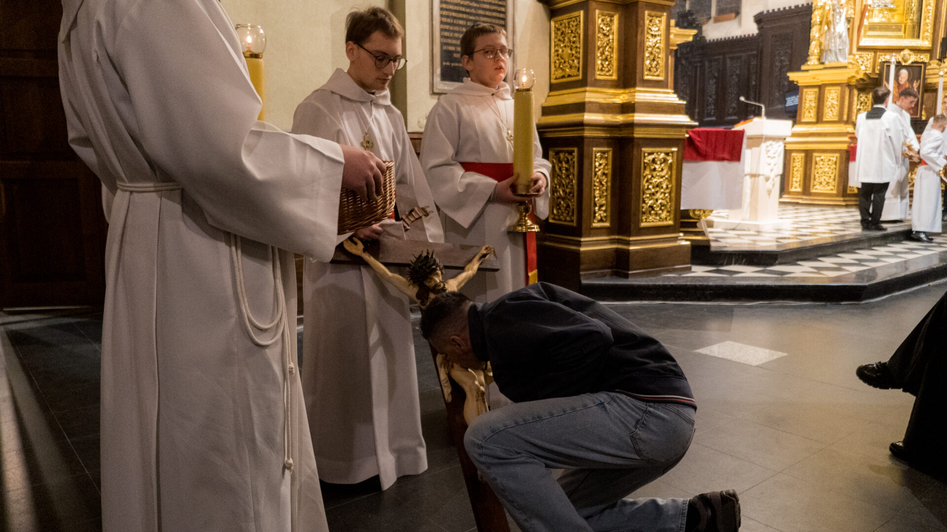 Centralnym wydarzeniem liturgii wielkopiątkowej była adoracja krzyża. Zasłonięty jubileuszowy krzyż wniesiono przed ołtarz. Biskup Jamrozek stopniowo odsłaniał ramiona krzyża i śpiewał trzykrotnie: „Oto drzewo Krzyża, na którym zawisło zbawienie świata”, na co wierni odpowiadali: „Pójdźmy z pokłonem”. Następnie wszyscy adorowali krzyż. Po adoracji krzyża z ciemnicy przyniesiono Najświętszy Sakrament i wierni przyjęli Komunię świętą.
