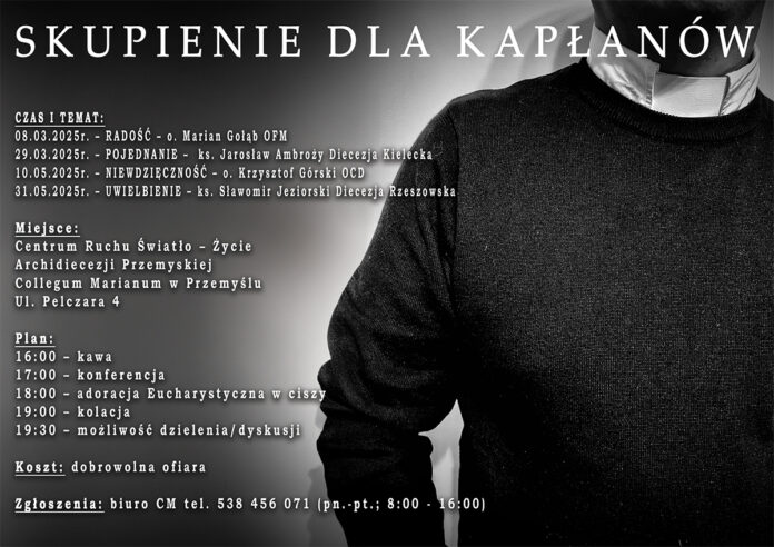 W Roku Jubileuszowym serdecznie zapraszamy wszystkich chętnych księży na skupienie dla kapłanów. Celem spotkań jest pochylenie się nad tajemnicą życia kapłańskiego i umocnienie w posłudze. Zaproszeni goście będą głosić konferencje tematyczne. Spotkania mają charakter niezobowiązujący i są oddolną inicjatywą.