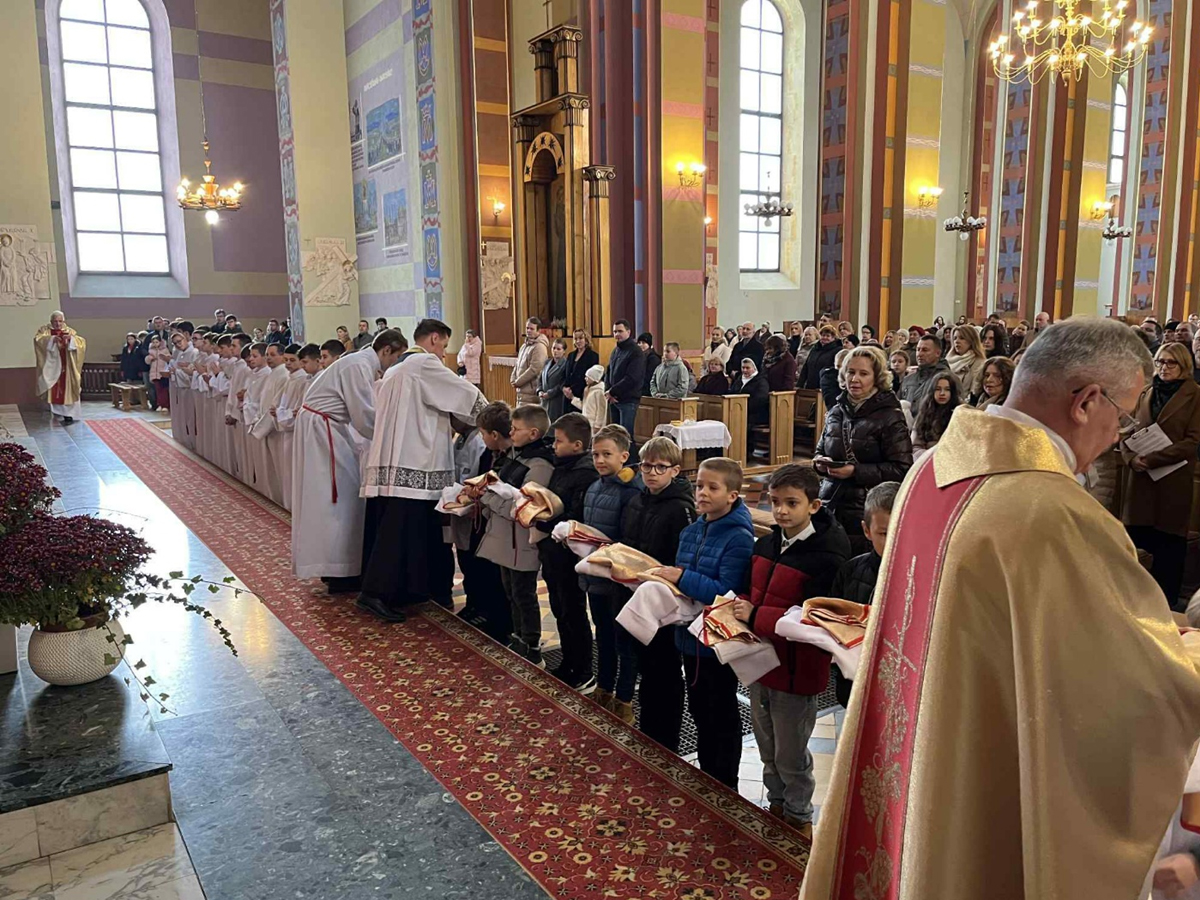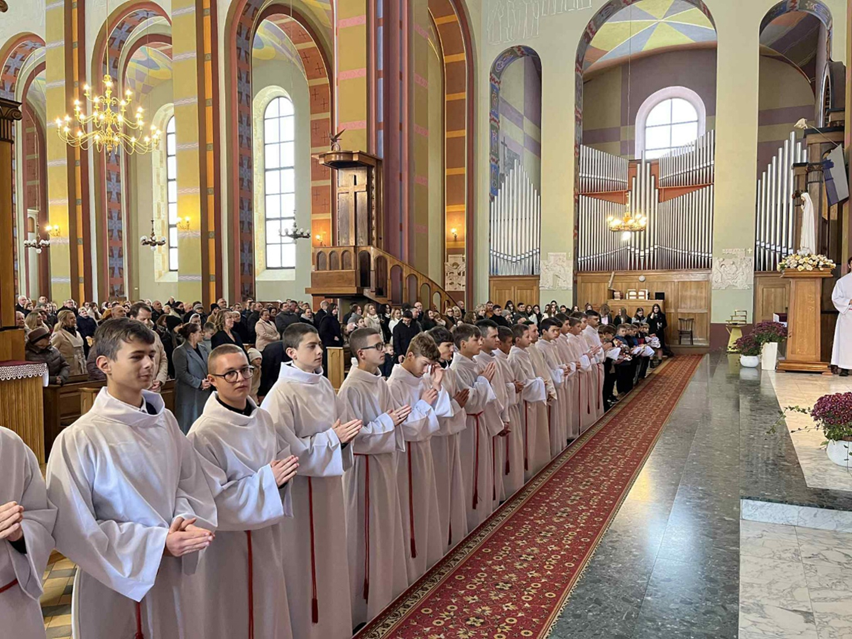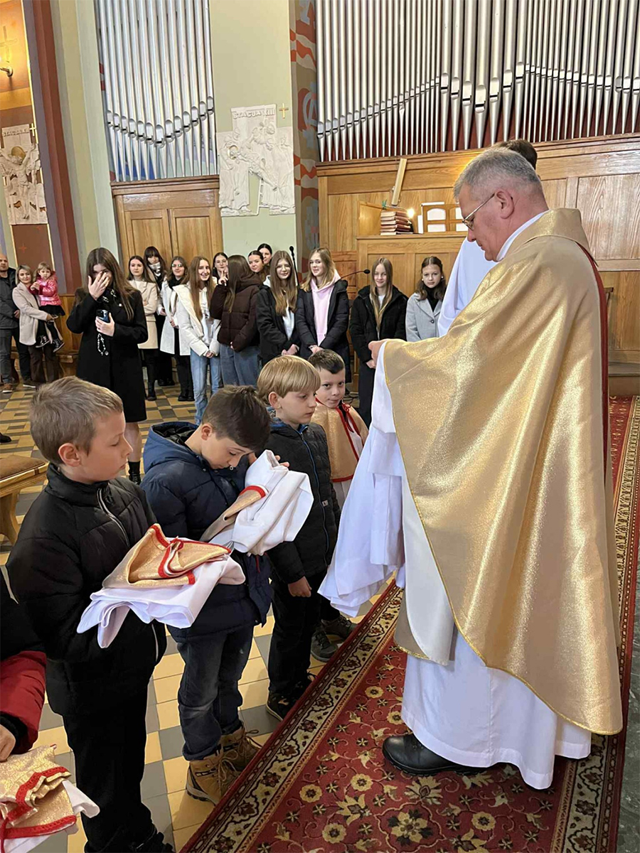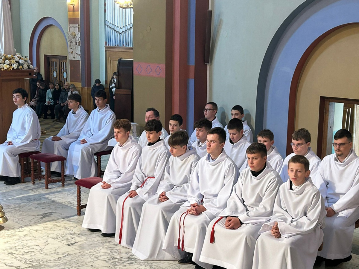 Obrzęd przyjęcie nowych członków do grona ministrantów odbył się podczas głównej Eucharystii. Szeregi LSO zasiliło 13 chłopców z młodszych klas Szkół Podstawowych naszej parafii, a 17 ministrantów otrzymało wyższy stopień wtajemniczenia liturgicznego – funkcję lektora i przywilej noszenia alby lektorskiej. W obecnym roku liturgicznym trzech ministrantów rozpoczęło też Archidiecezjalną Szkołę Ceremoniarza.