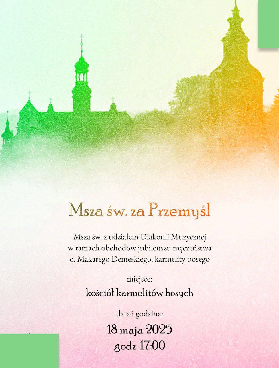 Ojcowie Karmelici w Przemyślu zapraszają na uroczystą Eucharystię w intencji Miasta Przemyśla i za wszystkich jego Mieszkańców. Modlitwa wpisuje się w obchody jubileuszu męczeństwa o. Makarego Demeskiego, karmelity bosego.