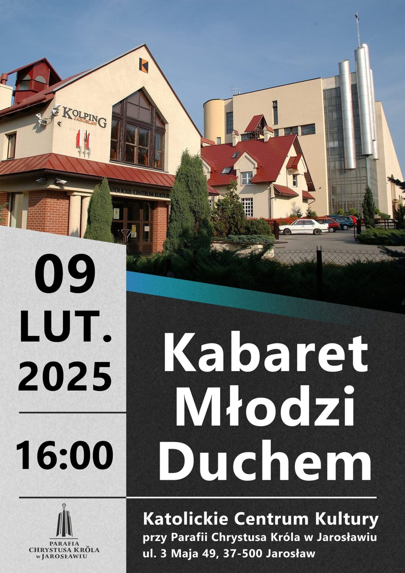 Parafia pw. Chrystusa Króla w Jarosławiu serdecznie zaprasza na występ Kabaretu Młodzi Duchem. To wyjątkowe wydarzenie odbędzie się w niedzielę, 9 lutego 2025 r., o godz. 16:00 w Katolickim Centrum Kultury funkcjonującym przy parafii (ul. 3 Maja 49, 37-500 Jarosław).