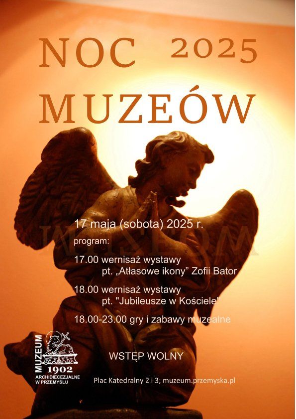 Muzeum Archidiecezjalne im. św. Józefa Sebastiana Pelczara Biskupa w Przemyślu serdecznie zaprasza na "Noc Muzeów 2025". W tym roku Muzeum przygotowało dla zwiedzających dwie wystawy czasowe: "Atłasowe Ikony" Zofii Bator oraz wystawę dokumentującą Jubileusze w Kościele. Zostały także przygotowane, jak każdego roku, gry i zabawy muzealne dla wszystkich.