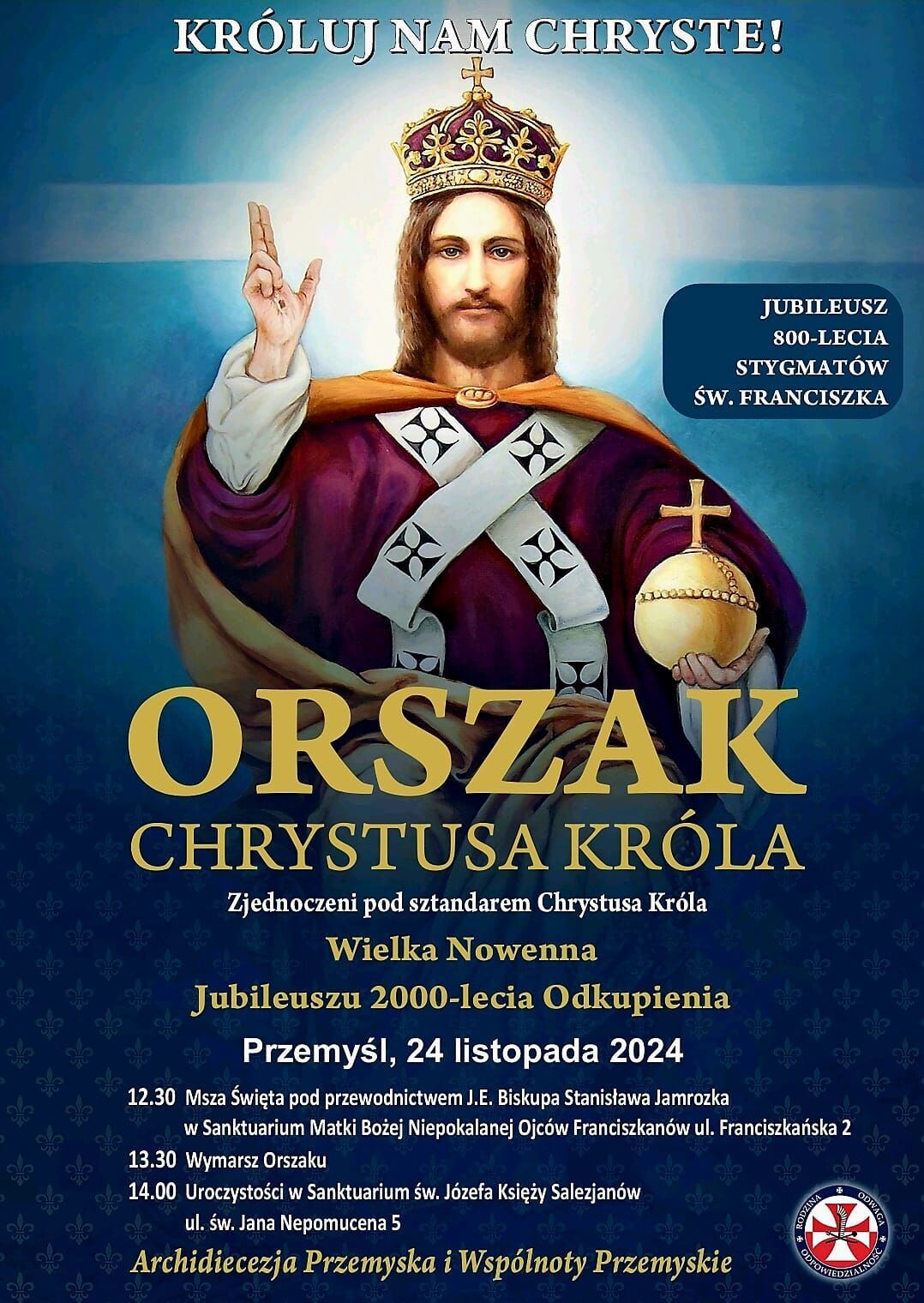 Serdecznie zapraszamy na Orszak Chrystusa Króla, który odbędzie się w niedzielę, 24 listopada 2024 r., w Przemyślu. Wydarzenie jest wezwaniem do zjednoczenia się pod sztandarem Jezusa Chrystusa w Wielkiej Nowennie Jubileuszu 2000-lecia Odkupienia.