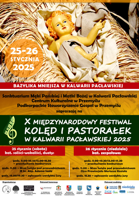 Sanktuarium Męki Pańskiej i Matki Bożej w Kalwarii Pacławskiej, Centrum Kulturalne w Przemyślu, Podkarpackie Stowarzyszenie Gospel w Przemyślu zapraszają na X Międzynarodowy Festiwal Kolęd i Pastorałek w Kalwarii Pacławskiej 2025 r., który odbędzie się w dniach 25-26 stycznia 2025 (sobota-niedziela) w Kalwarii Pacławskiej.
