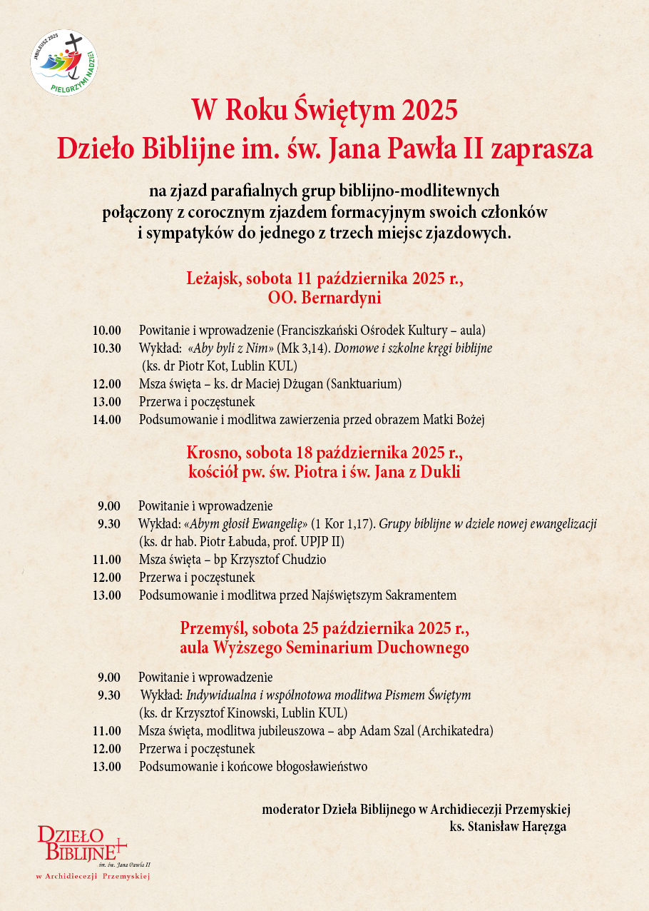 W trwającym Zwyczajnym Jubileuszu Roku 2025 Dzieło Biblijne Archidiecezji Przemyskiej zaprasza na zjazd parafialnych grup biblijno-modlitewnych, który odbędzie się w sobotę, 18 października w sanktuarium św. Jana Pawła II w Krośnie.