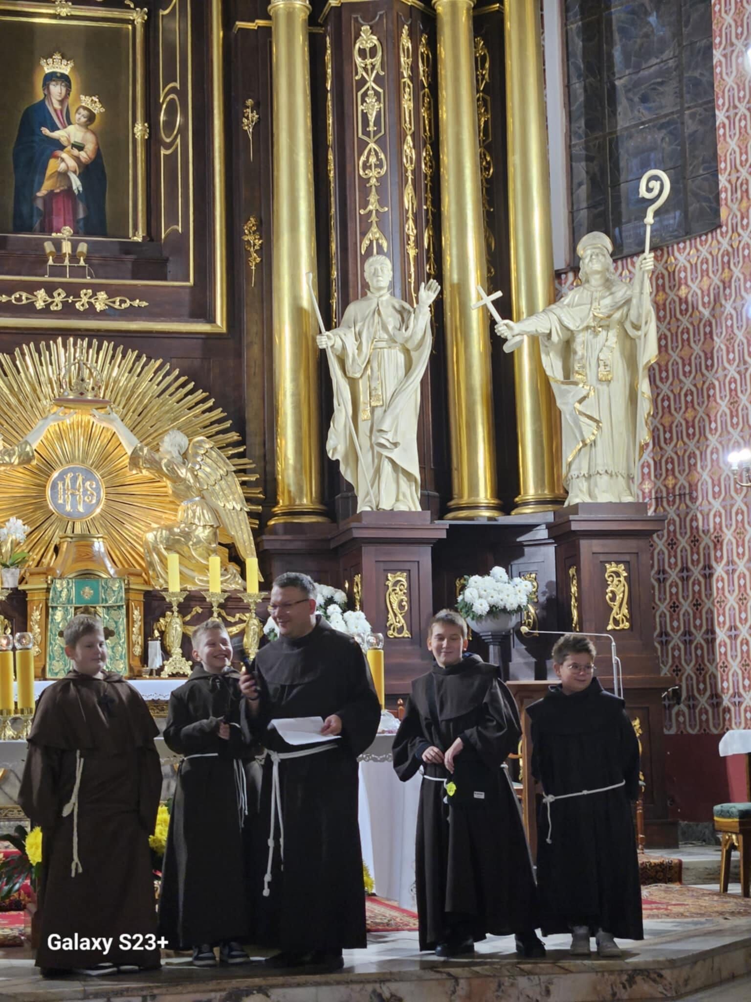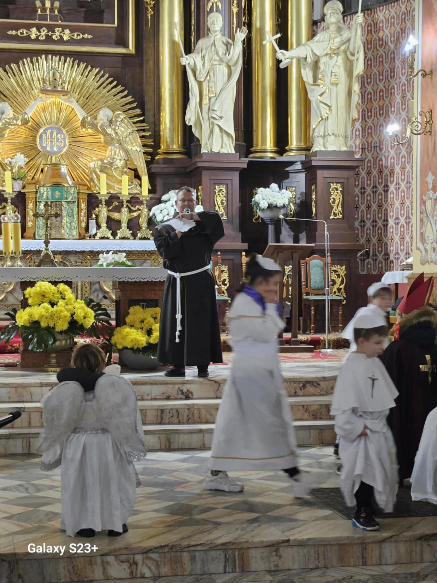 Najważniejszym punktem spotkania była oczywiście uroczysta Eucharystia, której przewodniczył ks. Marek Demski, wikariusz parafii przy Kolegiacie. W okolicznościowej homilii kaznodzieja wyjaśnił zgromadzonym co to znaczy być dziś świętym. – Być dzisiaj świętym to znaczy być promieniującym radością osobistego spotkania z Chrystusem. Być świętym dzisiaj to znaczy żyć realnie według Ewangelii, tak jak Chrystus; tak jak naucza Ojciec Święty. Zaufaj Panu! Świętość dzisiaj polega m.in. na tym, żeby rzeczywiście miłować innego człowieka, bliźniego, nie w słowach, ale w czynach. Być świętym, to żyć tak, żeby Boże światło poprzez moje słowa i czyny było widoczne dla innych. To żyć ze świadomością, że stanę kiedyś przed Bogiem. To czynić dobro, aby moje ręce nie były puste, gdy przyjdzie czas rozliczenia, aby wypełniać treścią swoją księgę życia. Bądź świętym, a to znaczy: módl się i pracuj rzetelnie. Pomagaj bliźnim, szczególnie ubogim i chorym. Rozmawiaj z każdym językiem miłości, nie rób przykrości, nie wyciskaj łez – mówił ks. Demski.