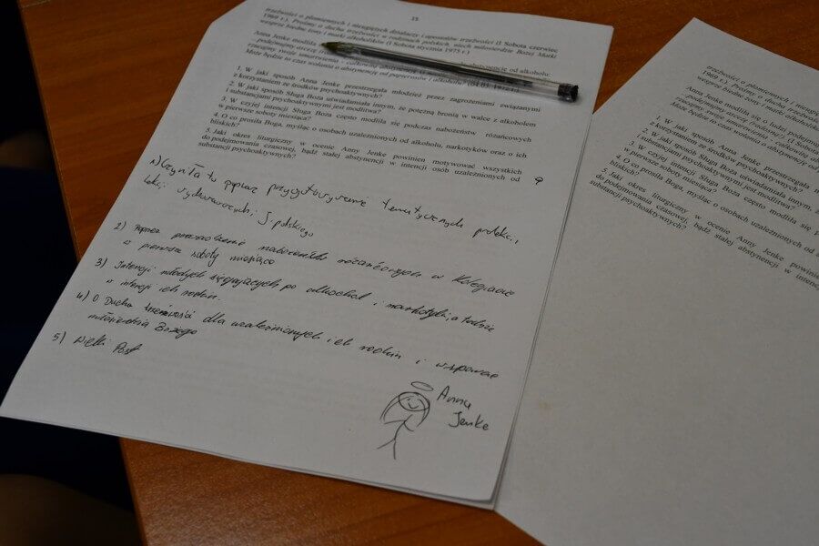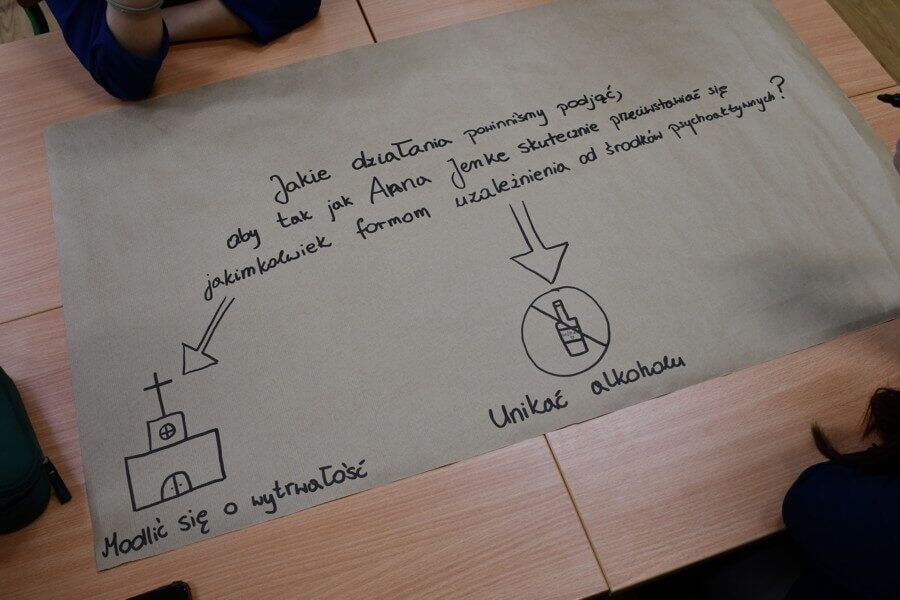 Warsztaty stały się dla młodzieży sposobnością do znalezienia odpowiedzi na następujące pytania: Jak definiuje się uzależnienie? Jak wygląda się jego mechanizm? Jakie negatywne skutki wywołuje alkoholizm, narkomania, bądź uzależnienie od innych substancji psychoaktywnych? Jak rozpoznać objawy uzależnienia? Licealiści poznali też takie formy przeciwstawiania się istniejącym zagrożeniom, jak: poszerzanie wiedzy na temat uzależnienia od alkoholu i innych środków psychoaktywnych m.in. przez lekturę odpowiednich książek, oglądanie tematycznych programów, udział w zajęciach edukacyjnych; korzystanie z pomocy oferowanej w szkole przez specjalistów; działania zmierzające do ograniczania dostępności alkoholu w przestrzeni publicznej; reagowanie w sytuacjach, gdy alkohol jest sprzedawany osobom nieletnim; rozwijanie cnoty umiarkowania w podejściu do alkoholu i substancji psychoaktywnych; respektowanie zakazu prowadzenia jakichkolwiek pojazdów po spożyciu środków psychoaktywnych; promowanie różnych form rozrywki bez obecności alkoholu; modlitwę w intencji uzależnionych od alkoholu, nikotyny narkotyków oraz ich rodzin; podejmowanie czasowej (miesiąc sierpień, Wielki Post) lub trwałej abstynencji od środków psychoaktywnych; ofiarowanie różnych wyrzeczeń i umartwień dnia codziennego jako wynagrodzenia za zło wynikające z alkoholizmu i narkomanii. Warsztaty zakończyły się przygotowaniem plakatów przypominających o głównym przesłaniu zorganizowanego wydarzenia.