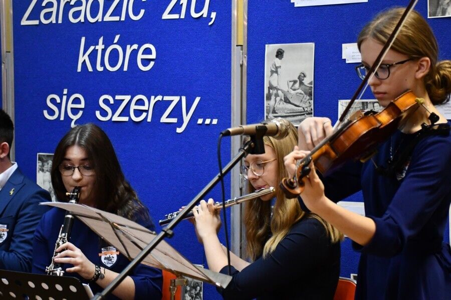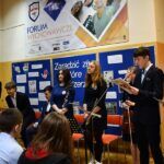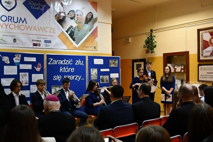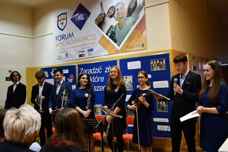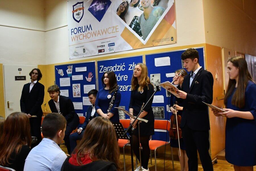 Następnie uczestnicy VI Forum Wychowawczego wzięli udział w koncercie nowopowstałego zespołu szkolnego. Na skrzypcach zagrały uczennice kl. 1a: Jagoda Potoczny i Maria Kłoda, na klarnecie Weronika Pieniążek z kl. 3b, a na werblu Mikołaj Przybylski z kl. 3a. Swój talent w grze na trąbce zaprezentowali: Maciej Nieckarz z kl. 4a i Maciej Tomczyk z kl. 3a. Młodzi muzycy wykonali takie utwory, jak: Merry Christmas Everyone, Last Christmas, Christmas Carol March. Prezentując swoje zdolności pokazali, że rozwijanie pasji i uzdolnień to nie tylko dobry sposób na konstruktywne wypełnianie wolnego czasu, ale także skuteczna formą unikania różnych zagrożeń.