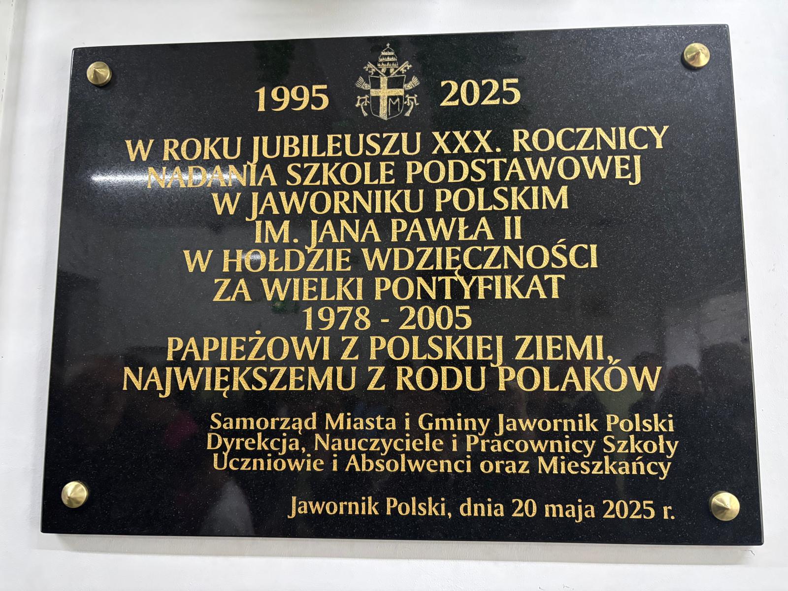 We wtorek, 20 maja 2025 r., Szkoła Podstawowa im. Jana Pawła II w Jaworniku Polskim świętowała jubileusz 30. rocznicy nadania placówce imienia Patrona. Była to pierwsza szkoła w archidiecezji przemyskiej, która za swojego patrona obrała Papieża Polaka.