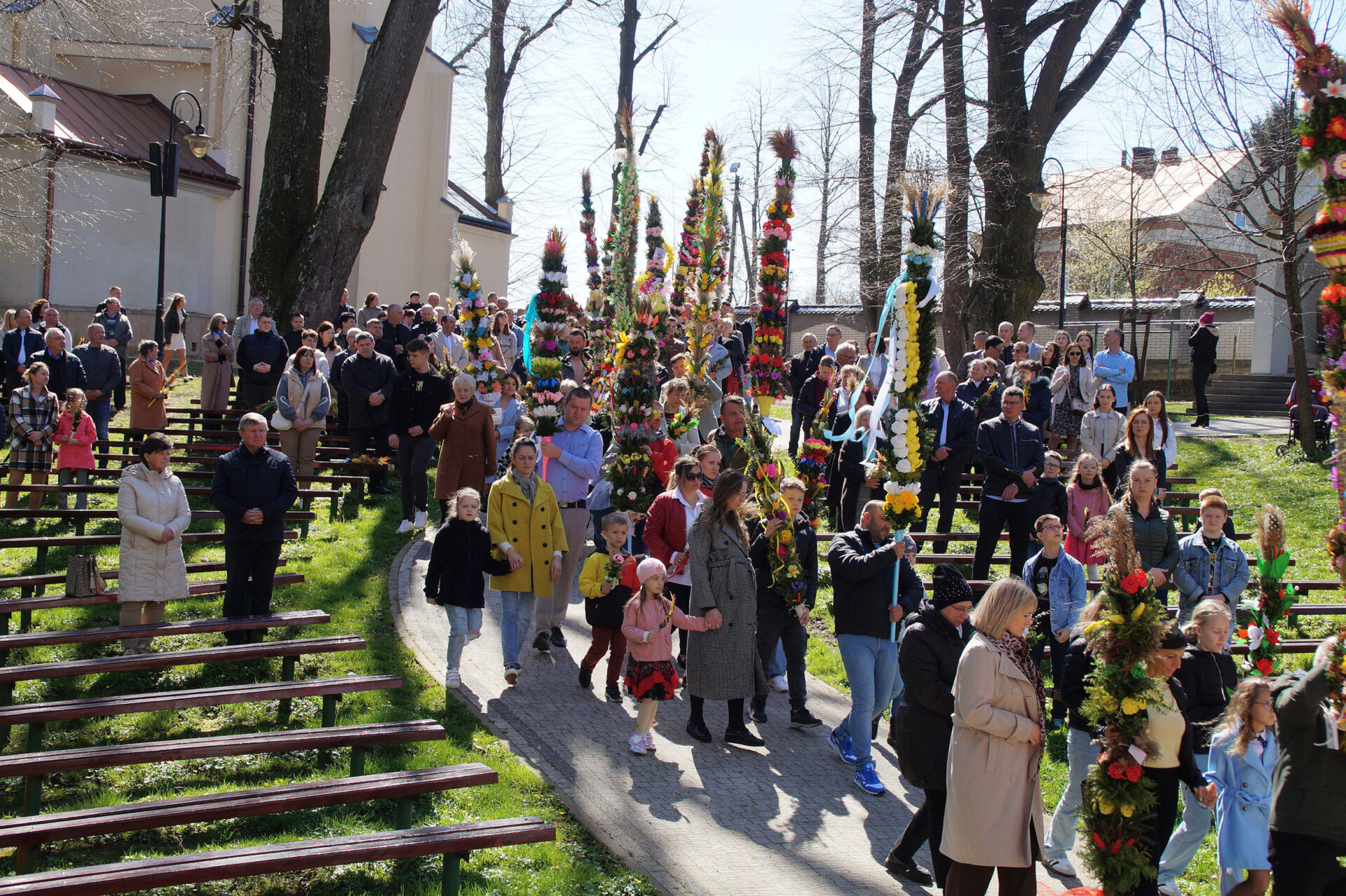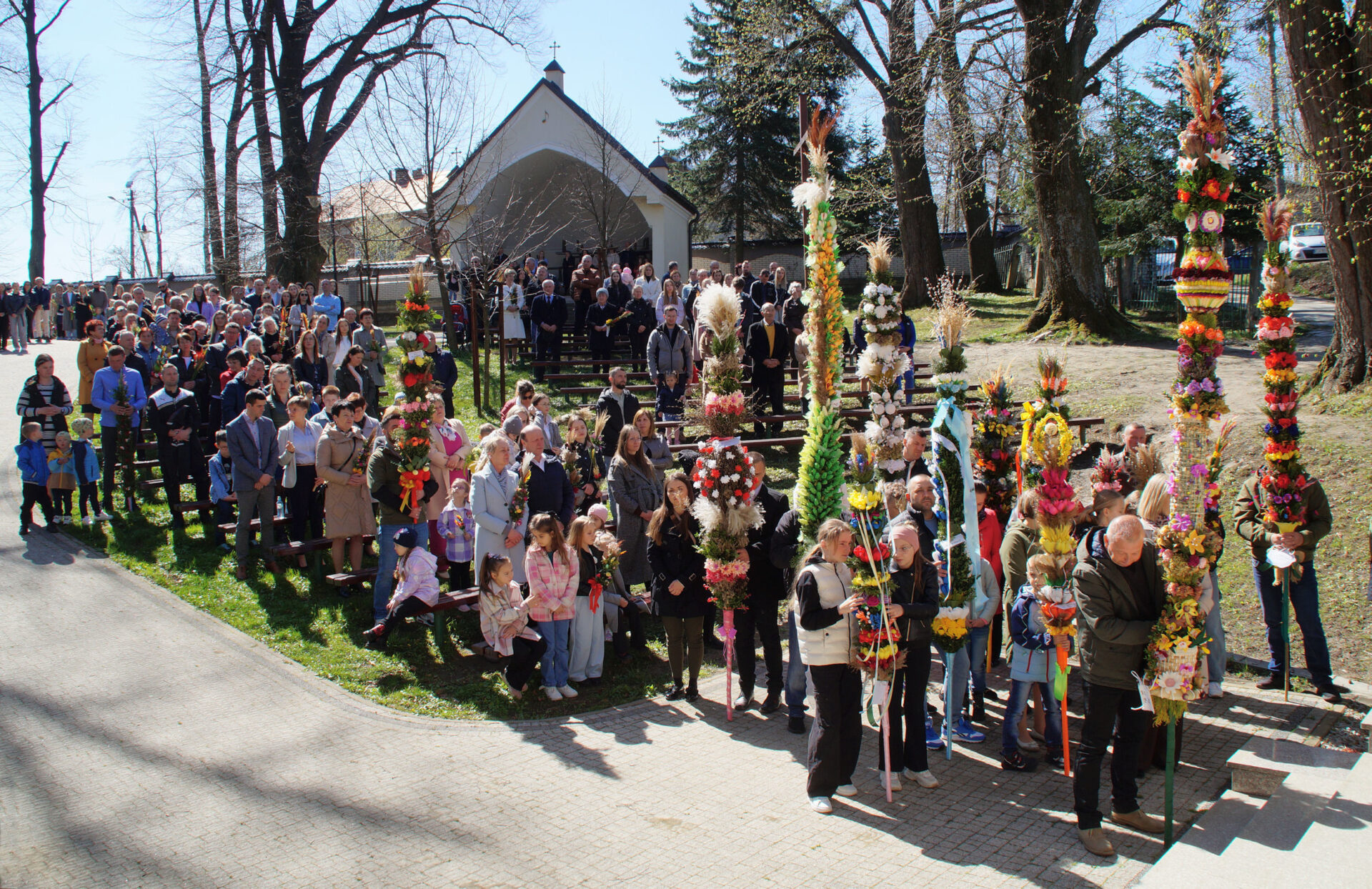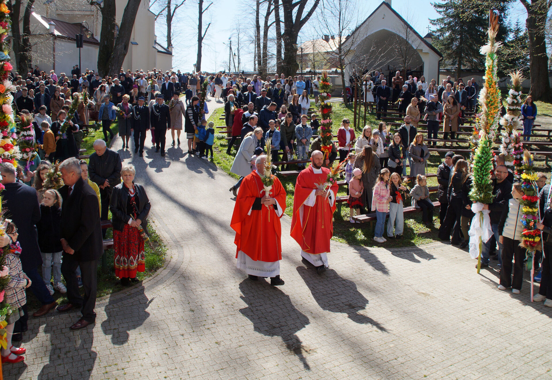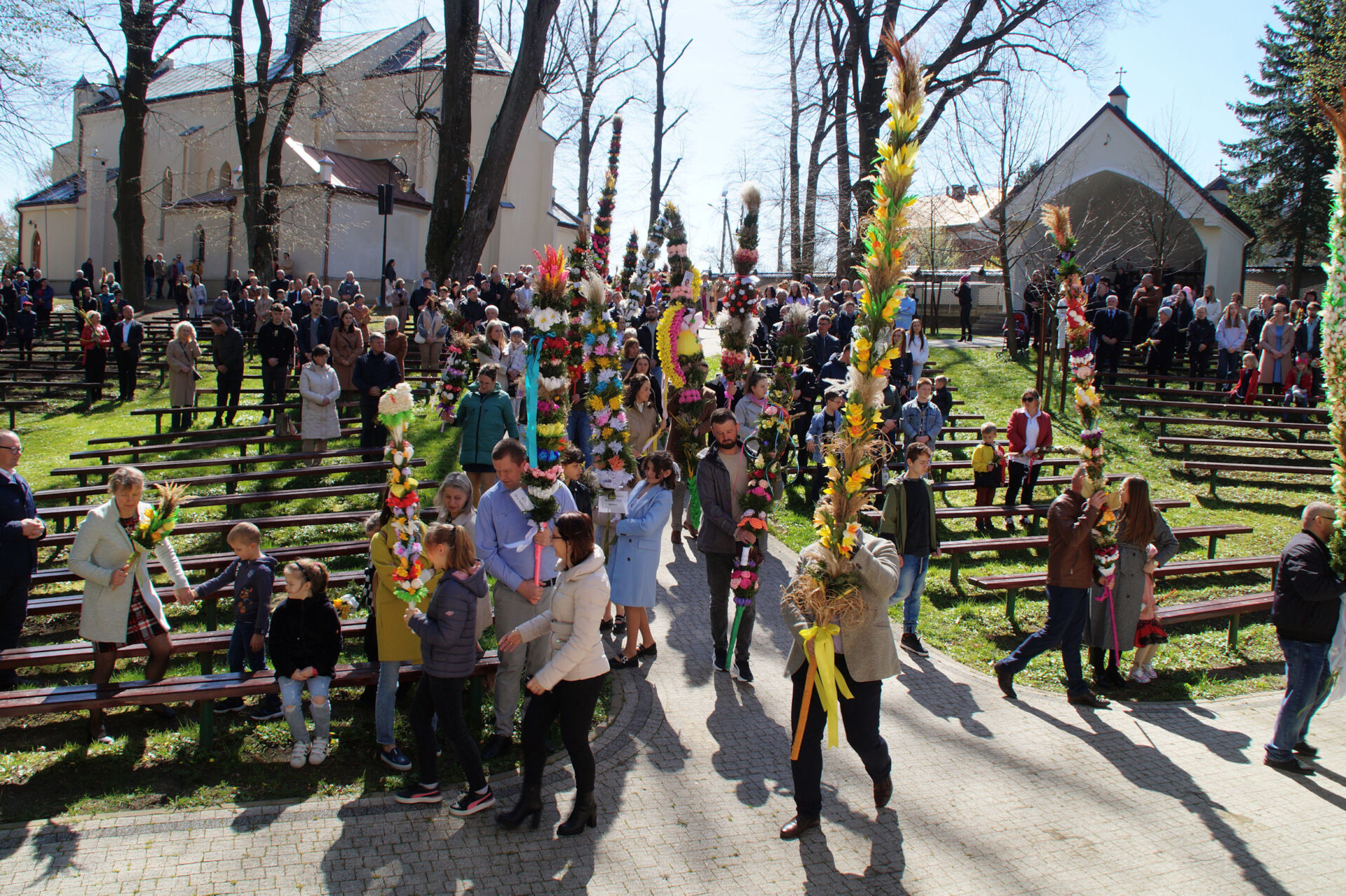 Palmy Wielkanocne zostały pobłogosławione na początku Eucharystii o godz. 11.00 przy Parku Pielgrzyma. Następnie wyruszyła uroczysta procesja w kierunku ołtarza polowego za sanktuarium, gdzie sprawowana była Msza Święta. Jak co roku odczytano z podziałem na role fragment o Męce Pańskiej.
