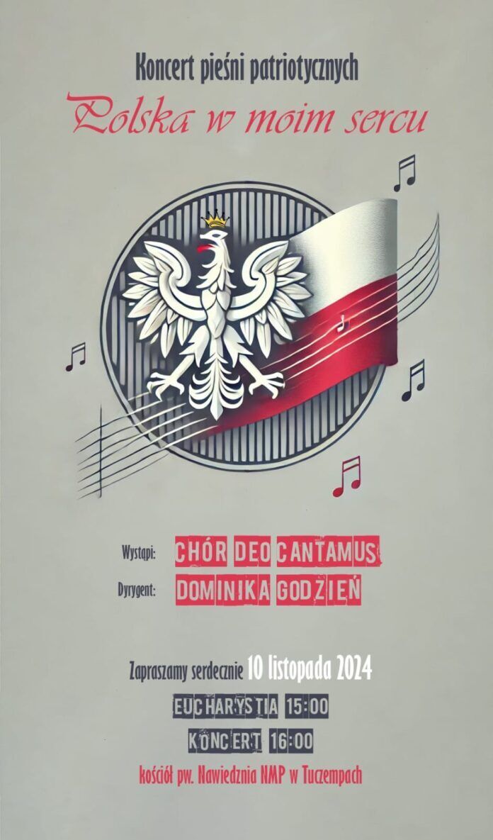 Parafia pw. Nawiedzenia Najświętszej Maryi Panny w Tuczempach serdecznie zaprasza na koncert pieśni patriotycznych „Polska w moim sercu”. Wystąpi Chór Deo Cantamus pod dyrekcją Dominiki Godzień.
