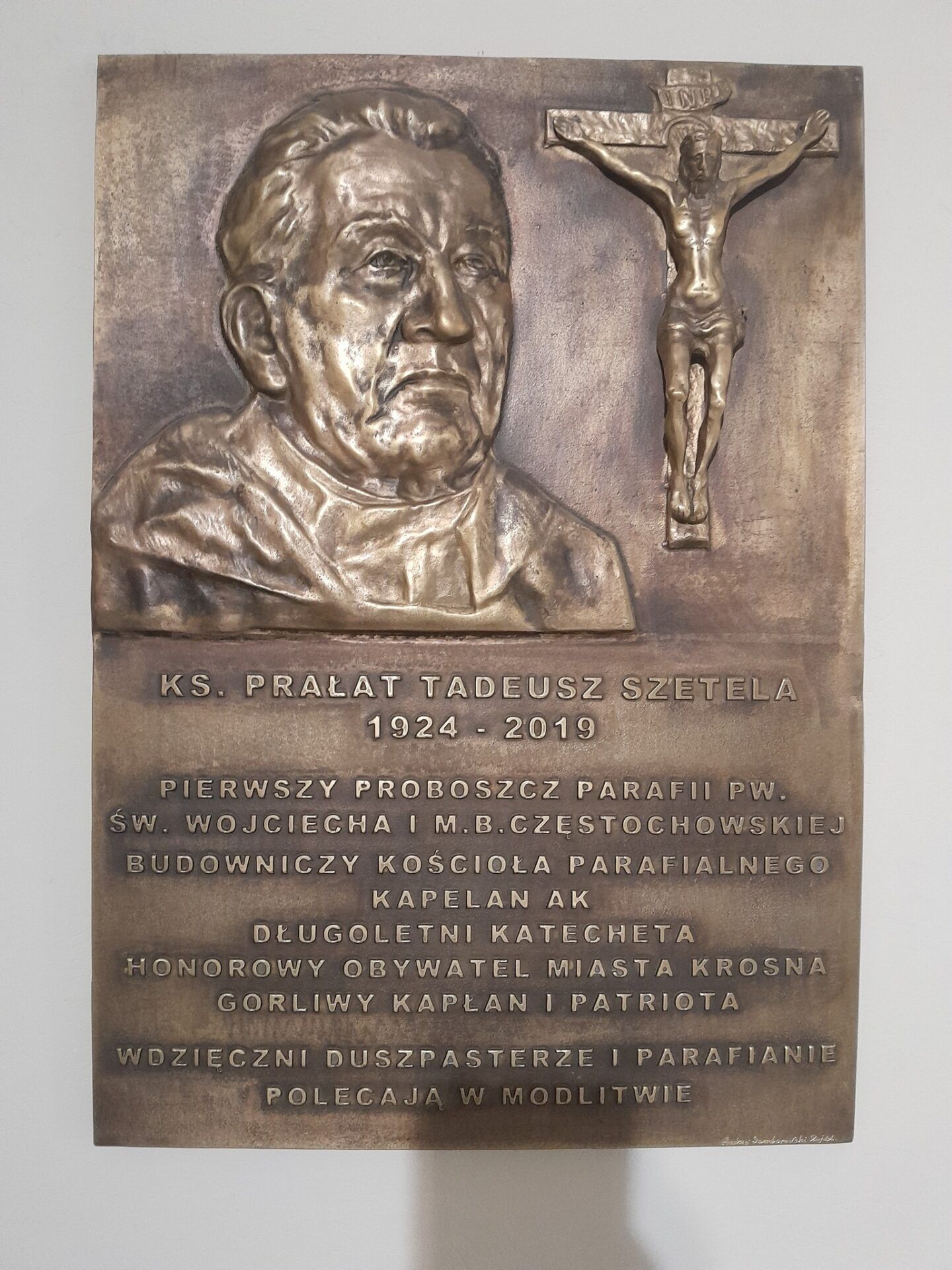 Uroczystości tego dnia dopełniło poświęcenie tablicy pamięci ks. Prał. Tadeusza Szeteli pierwszego proboszcza i inicjatora budowy nowego kościoła parafialnego. W niełatwych komunistycznych warunkach tworzył parafię najpierw przy nie wielkim kościółku pw. św. Wojciecha w 1967 jako rektor tej świątyni, a rok potem już proboszcz nowej parafii. Chociaż sytuacja gospodarcza nie sprzyjała, to jednak pragnienie posiadania większej świątyni ze względu na powiększającą się parafię sprawiło, że zapadła decyzja ks. Proboszcza Tadeusza i parafian o budowie nowego kościoła. Po 10 latach budowa świątyni dobiegła końca w 1995, która dwa lata potem została poświęcona przez ks. Arcybiskupa Józefa Michalika. Pragnieniem obecnego proboszcza i parafian było ufundowanie tablicy jak wyraz pamięci i wdzięczności śp. ks. Tadeuszowi za ofiarną pracę przy budowie kościoła parafialnego jak i za pracę duszpasterską. Obecnie dzięki inicjatywie ks. Proboszcza w kościele w bocznej nawie jest usytuowana kaplica poświęcona wielkim Polakom jak św. Jan Paweł II i bł. ks. Jerzy Popiełuszko wraz z ich relikwiami, jest też Krzyż z kościoła pw. Św. Stanisława z Żoliborza w Warszawie.