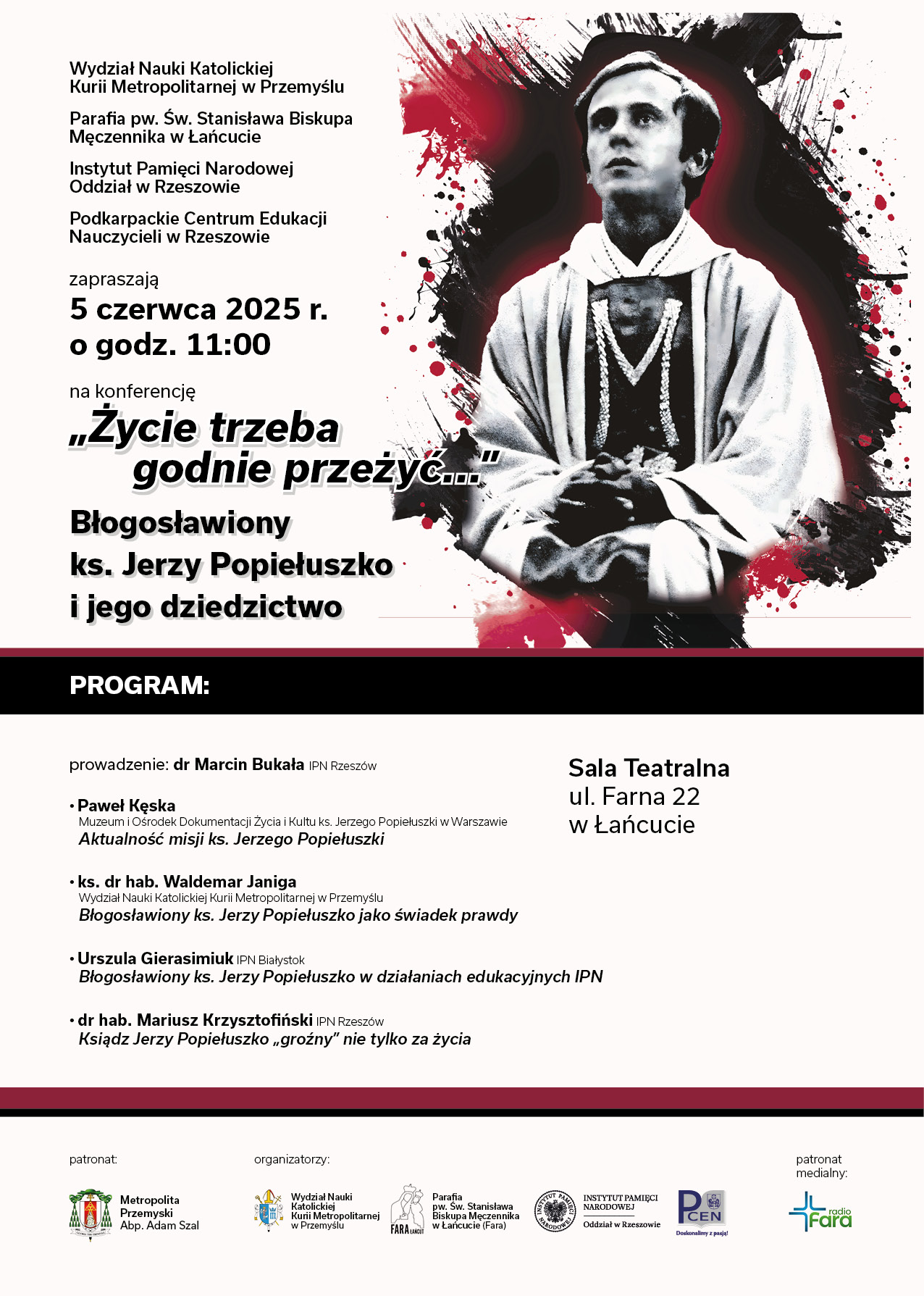 Wydział Nauki Katolickiej Kurii Metropolitalnej w Przemyślu, parafia pw. św. Stanisława Biskupa Męczennika w Łańcucie, Instytut Pamięci Narodowej Oddział w Rzeszowie i Podkarpackie Centrum Edukacji Nauczycieli w Rzeszowie zapraszają na konferencję naukową pt. „Życie trzeba godnie przeżyć” poświęconą pamięci bł. ks. Jerzego Popiełuszko.