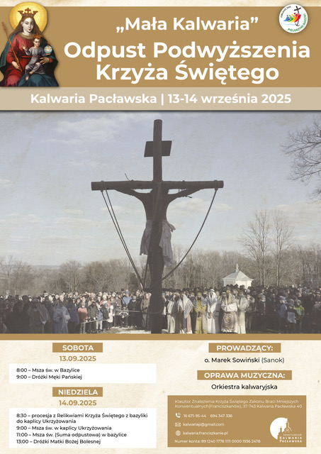 Ojcowie Franciszkanie z Kalwarii Pacławskiej serdecznie zapraszają na coroczny Odpust Podwyższenia Krzyża Świętego – tzw. „Mała Kalwaria”, który odbędzie się w dniach 13-14 września 2025 r.
