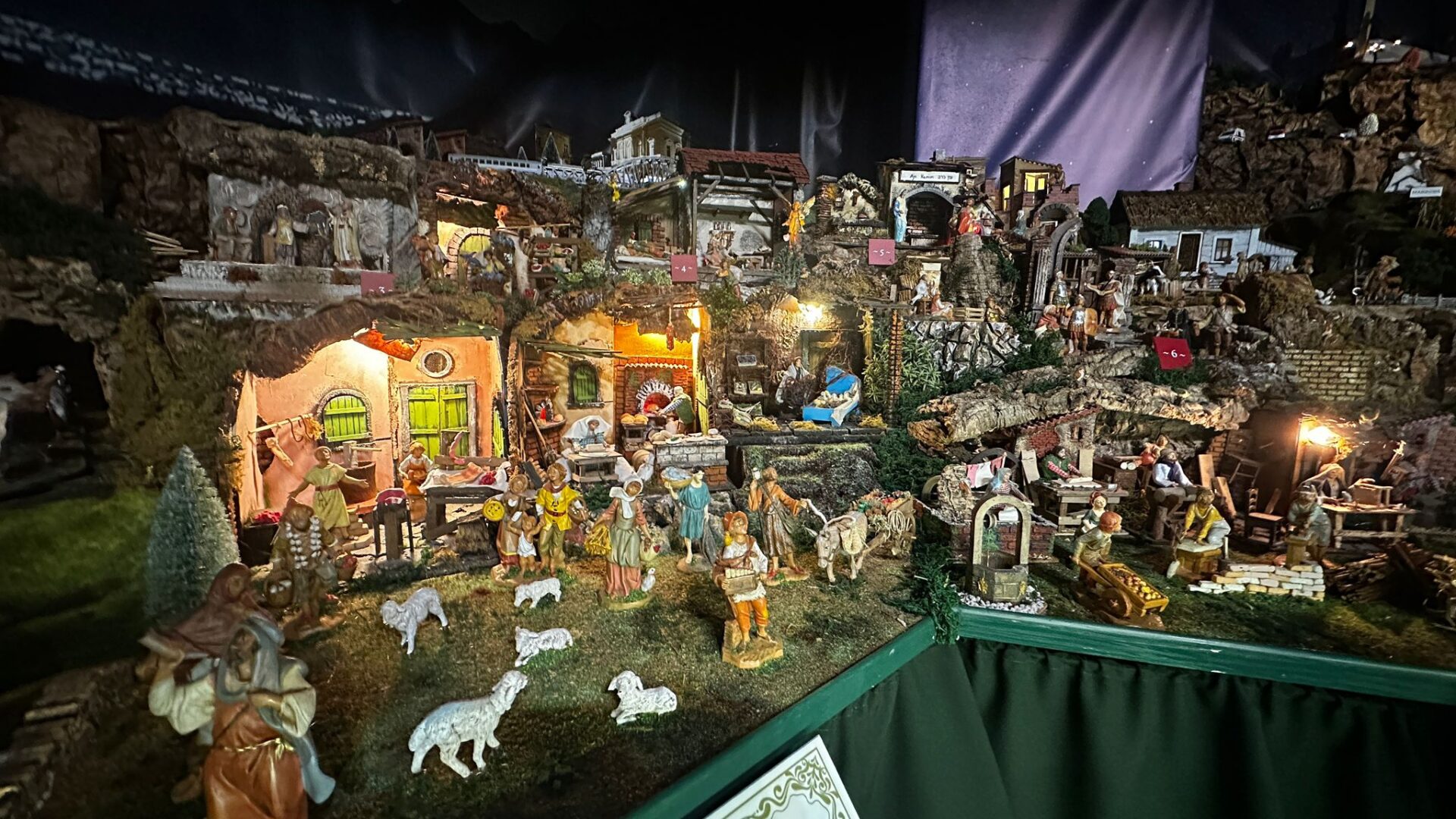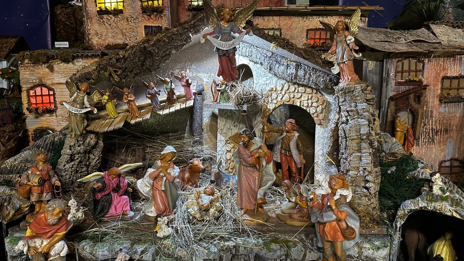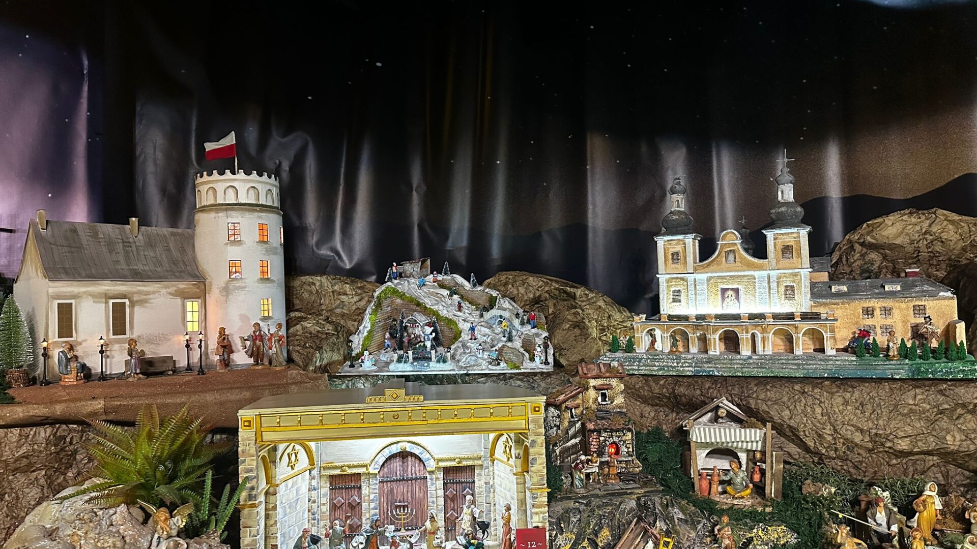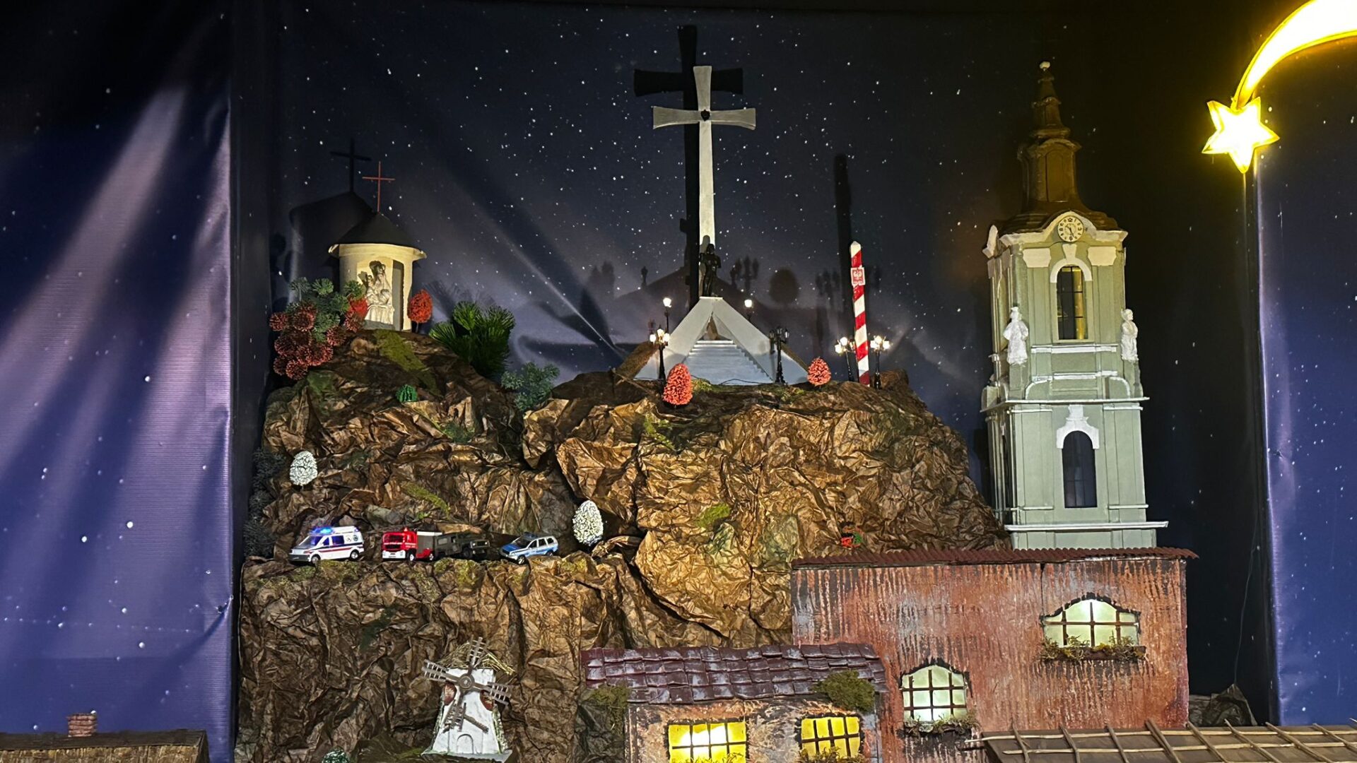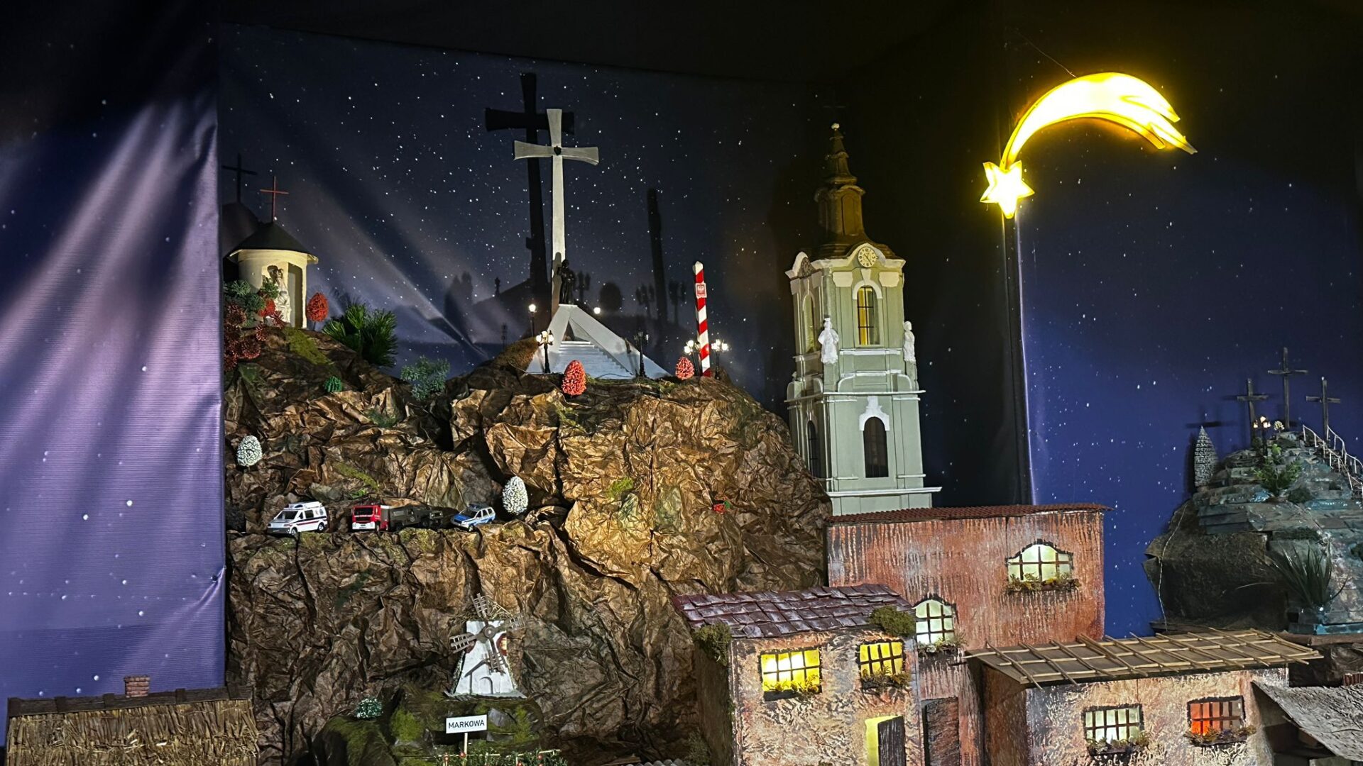 Ks. Bartosz Rajnowski: Tak, właśnie stąd nazwa „Szopka Przemyska”, ponieważ powyżej tych scen biblijnych możemy zauważyć takie sceny, które są związane z Przemyślem, z okolicą, a nawet z archidiecezją. A więc zobaczymy piękny dworzec kolejowy z jeżdżącymi pociągami, Krzyż Zawierzenia, znajdujący się na Zniesieniu w Przemyślu skąd Chrystus niejako spogląda na Przemyśl, błogosławiąc miastu i całej archidiecezji. Jest kapliczka z Matką Bożą Jackową. Jest wieża katedralna. Jest słup graniczny, jako że diecezja graniczy z Ukrainą i ze Słowacją. Mamy też Wzgórze Trzech Krzyży, Zamek Kazimierzowski, ale mamy także przemyski stok narciarski i nieodległą Kalwarię Pacławską.