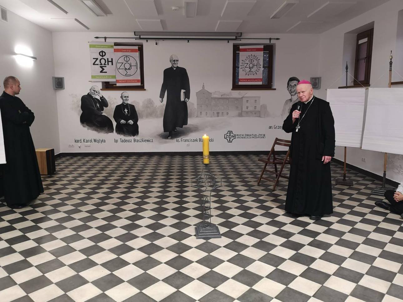 W krótkim słowie metropolita przemyski nawiązał do niedawno odmalowanej auli, w której znalazły się teraz wizerunki: św. Jana Pawła II, Czcigodnego Sługi Bożego ks. Franciszka Blachnickiego i bp. Tadeusza Błaszkiewicza. – Na temat tych osób jest wiele opowiadań, wiele historii – mówił hierarcha przytaczając, że Ruch Światło-Życie napotykał na początku swojej działalności na wiele problemów. – Na szczęście udało się go obronić. Dzięki temu szacuje się, że około dziesięciu milionów Polaków przeszło przez formację, w większym lub mniejszym stopniu. To są oczywiście bardzo ogólne i szacunkowe obliczenia, ale to pokazuje, że jest to bardzo zasłużony Ruch – dodał i wyraził radość, że Centrum Ruchu Światło-Życie Archidiecezji Przemyskiej znajduje się właśnie Collegium Marianum.