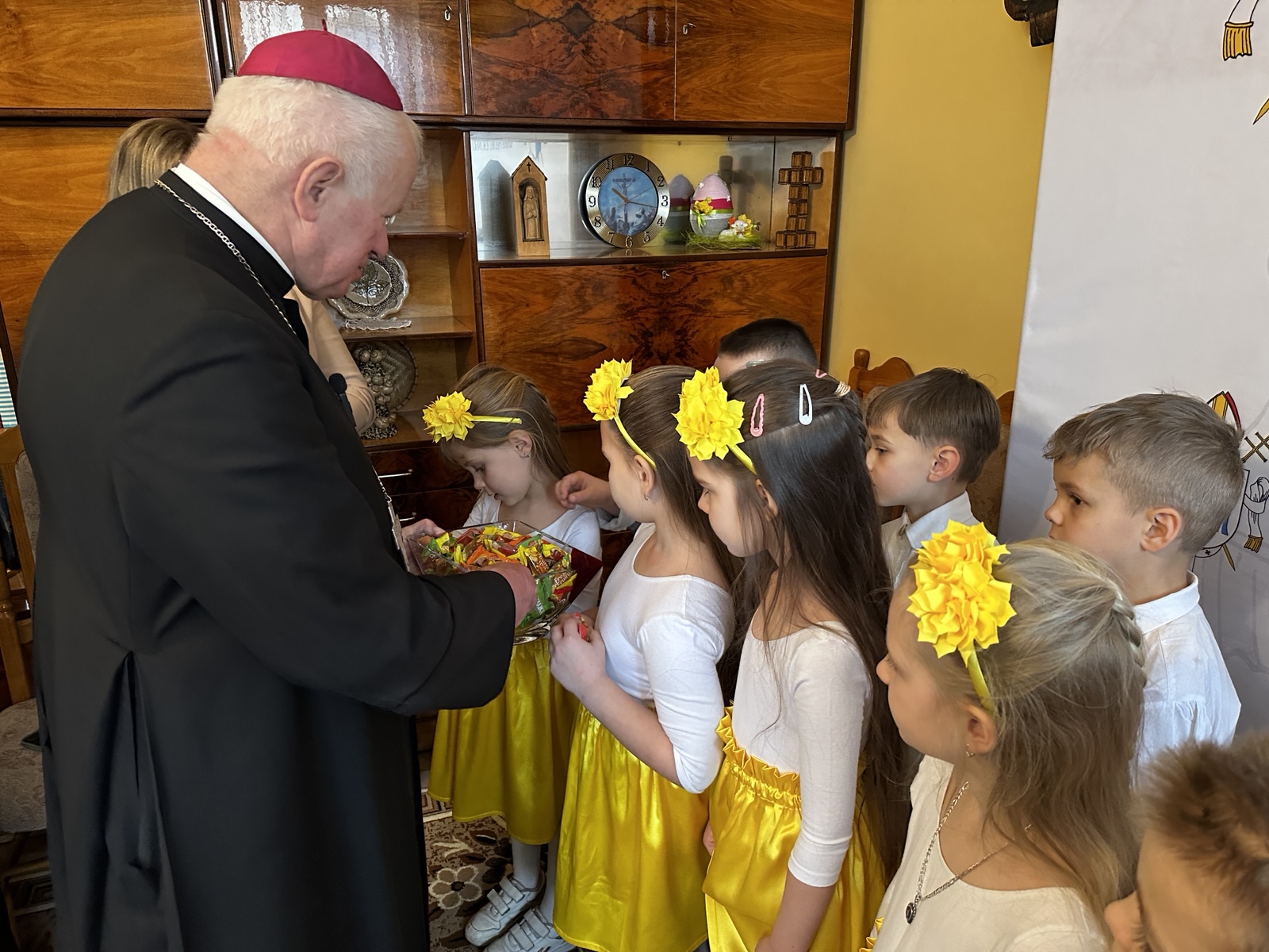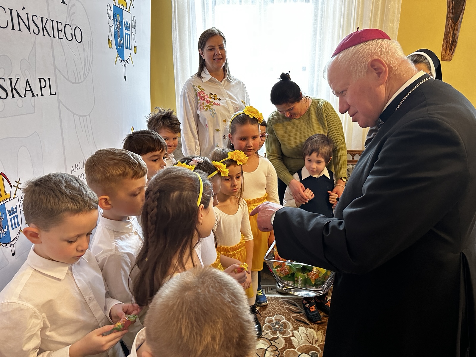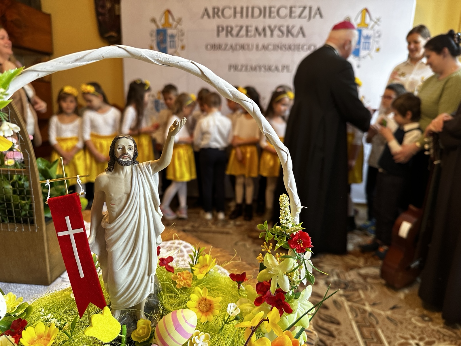 Na początku dzieci zaśpiewały piosenki nawiązujące do męki, śmierci i zmartwychwstania Pana Jezusa. Następnie abp Adam Szal podziękował dzieciom za ich obecność i życzenia, podkreślając znaczenie świadectwa o zmartwychwstaniu Jezusa. – Pan Jezus zobowiązał swoich uczniów, tych których spotkał, także i kobiety, żeby były świadkami zmartwychwstania – zaznaczył hierarcha. – My też mamy świadczyć o tym, że Pan Jezus umarł za nas, że także zmartwychwstał. Kiedy świadczymy? Świadczymy, jak jesteśmy dobrzy. Świadczymy, jak idziemy do kościoła na Mszę świętą w niedzielę. Każda Msza święta przypomina nam to, że Pan Jezus umarł i że zmartwychwstał – dodał mówiąc, że „bardzo ładny jest widok, jak rodzice przyprowadzają dzieci do kościoła”.