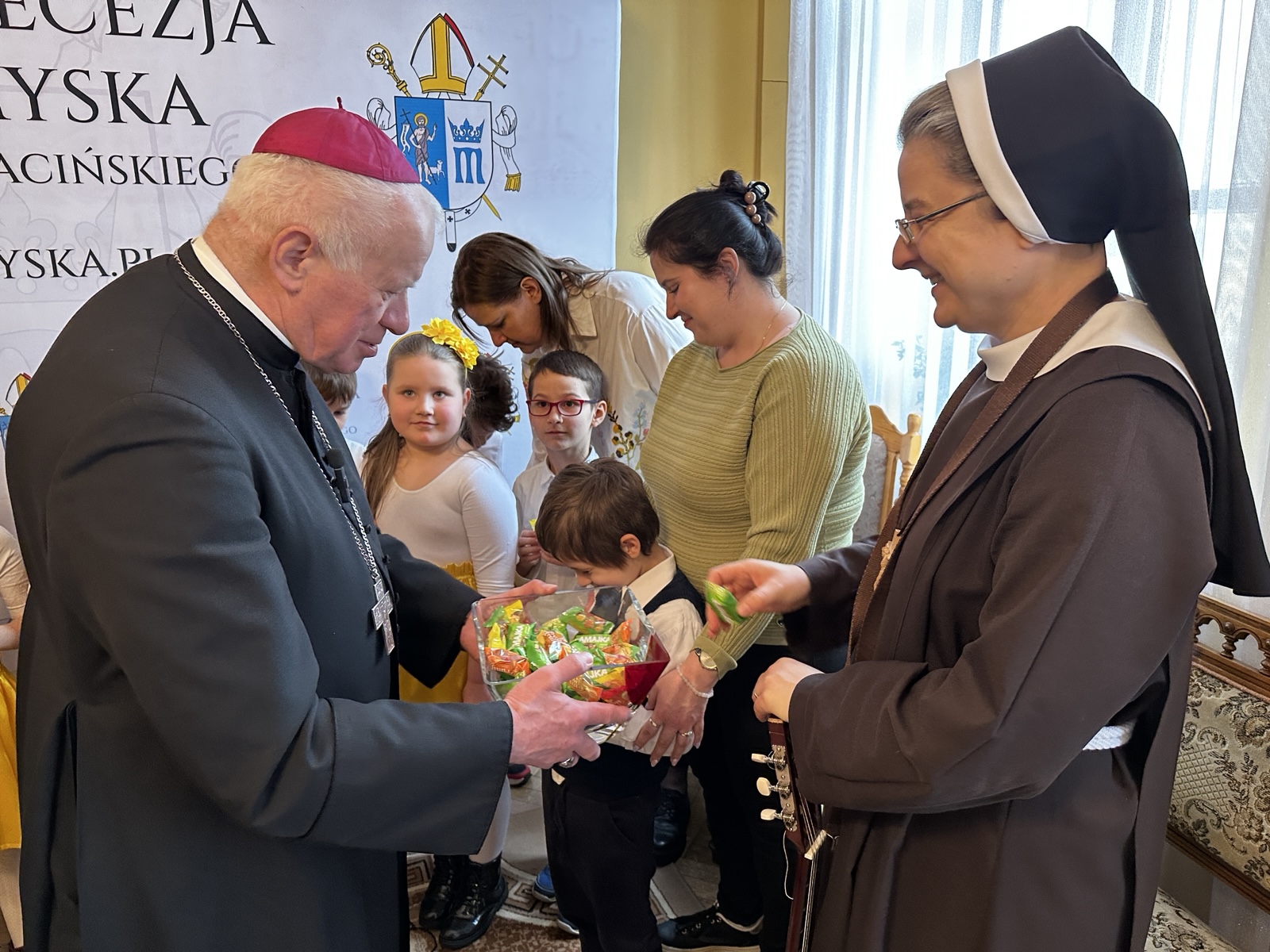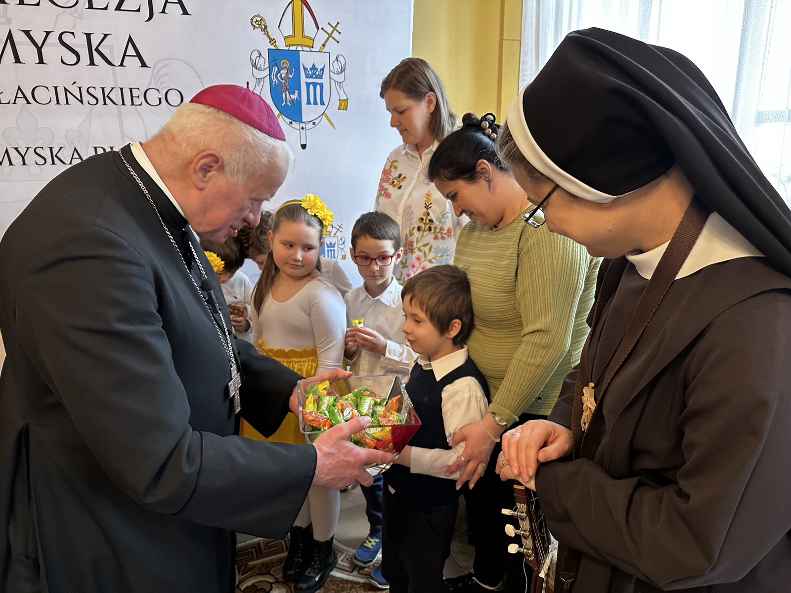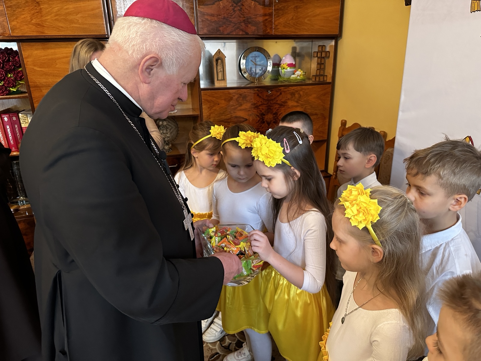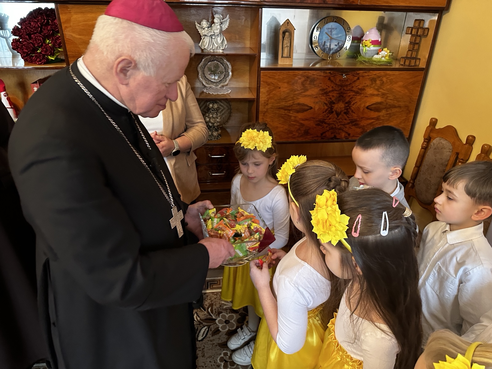 W swoich życzeniach abp Szal wyraził nadzieję, że święta będą radosne nie tylko z powodu obfitego stołu, ale przede wszystkim dzięki obecności bliskich i wspólnemu cieszeniu się prawdą o zmartwychwstaniu. – Chciałbym życzyć wam, ale też siostrom i paniom, żeby te święta były radosne – powiedział metropolita przemyski i zachęcił, aby w tym świątecznym czasie nie zapominać o dzieciach, które tej radości nie mają z powodu wojny. – Chciałbym życzyć wam i wszystkim dzieciom, żeby żyły w pokoju. Żeby mogły chodzić do przedszkola tak jak wy, uczyć się, śpiewać tak jak wy. Żeby dzieci nie bały się to, że jakieś pociski spadną. Módlmy się o pokój i o to, żeby na całym świecie była zgoda, bo Pan Jezus przyniósł ze sobą właśnie pokój, radość i miłość – dodał.