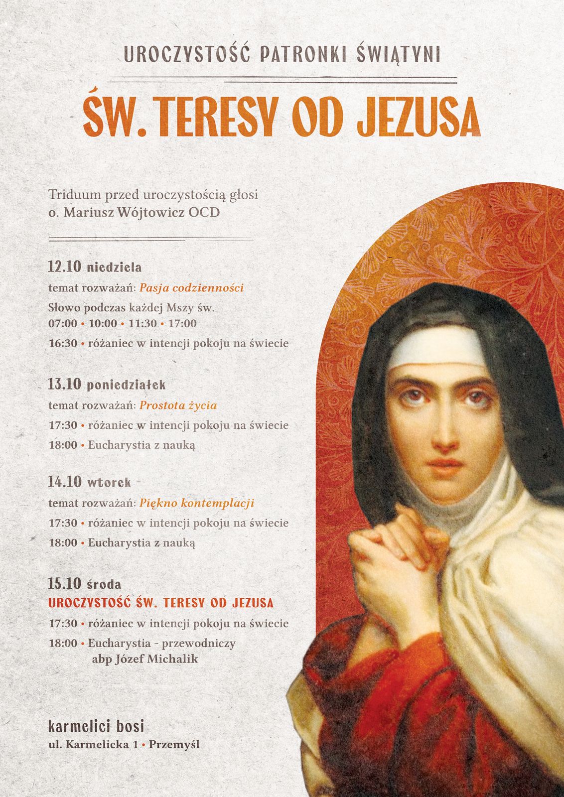 Uroczystej Eucharystii w dniu liturgicznego wspomnienia św. Teresy, 15 października 2025 r., o godz. 18:00 będzie przewodniczył abp Józef Michalik.