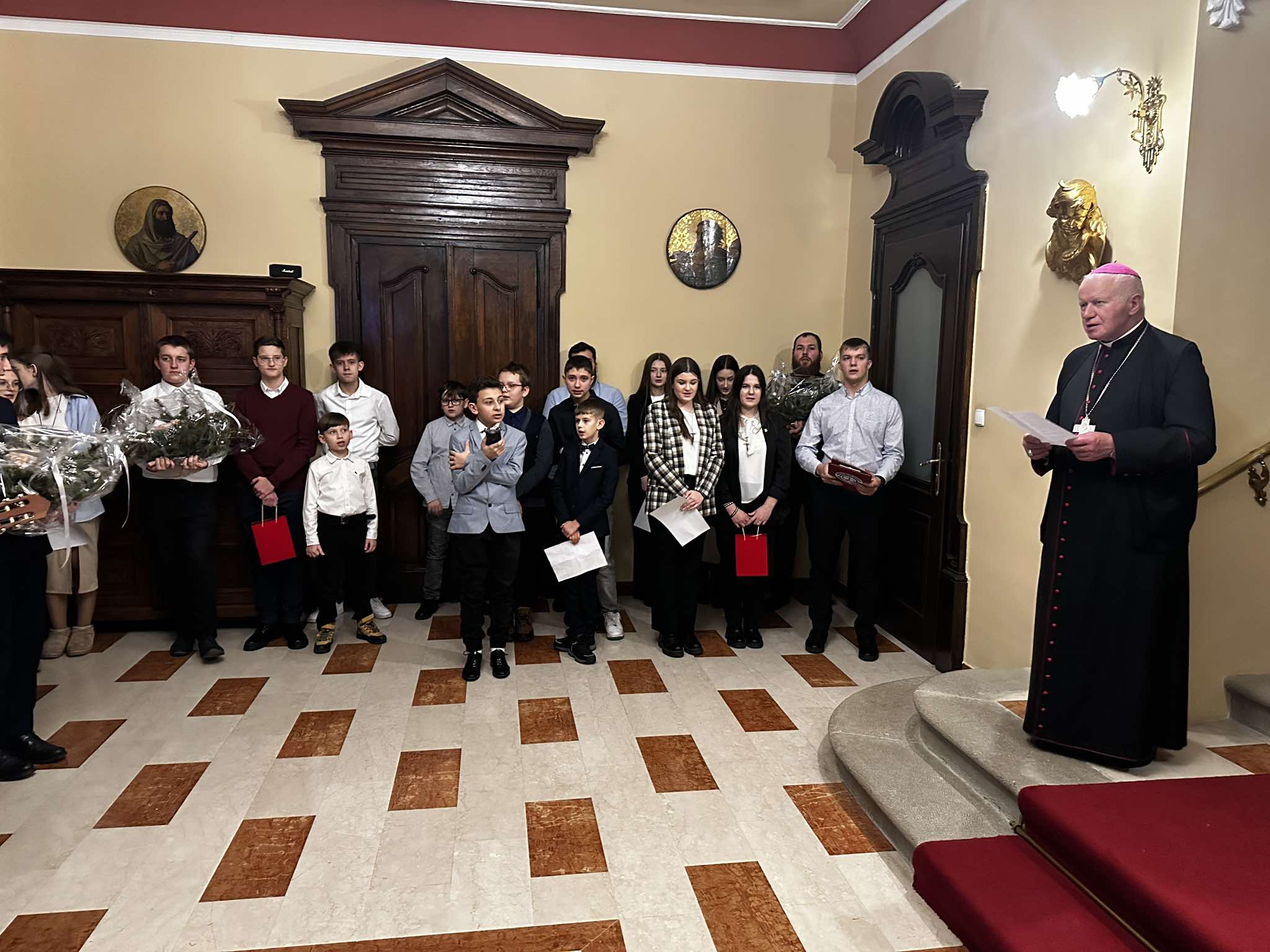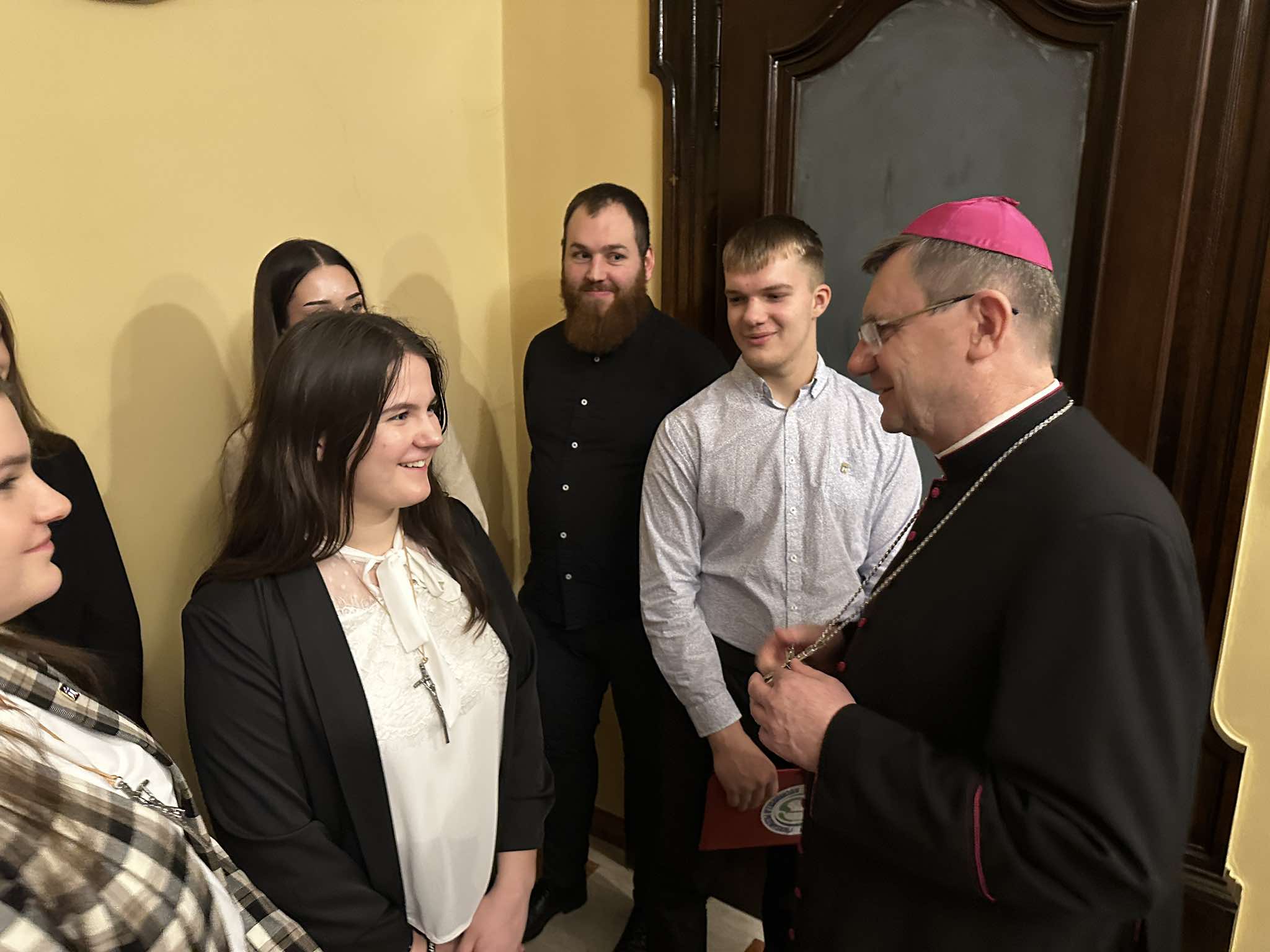 Na końcu przemawiał bp Krzysztof Chudzio przypominając, że młodzi są nadzieją Kościoła, ale też Ojczyzny i archidiecezji przemyskiej. – Stąd szukamy podstawy tej nadziei. Wszyscy zapatrzeni jesteście w Tego, który rzeczywiście przyniósł nam nadzieję, bo to padło w waszych życzeniach. Ale pewnie jako młodzież patrzycie na Pana Jezusa, jako na rówieśnika, kiedy spotykamy go w świątyni gdy poszukują go rodzice. Ale spotykamy Go, jako tego, który chce przebywać w domu Ojca, w sprawach Ojca. Czyli nadzieja rodzi się z wiary, ale też z przebywania z Panem Bogiem – tłumaczył hierarcha. – Czas wzrastania to czas napełniania się Bożą Mądrością – dodał.
