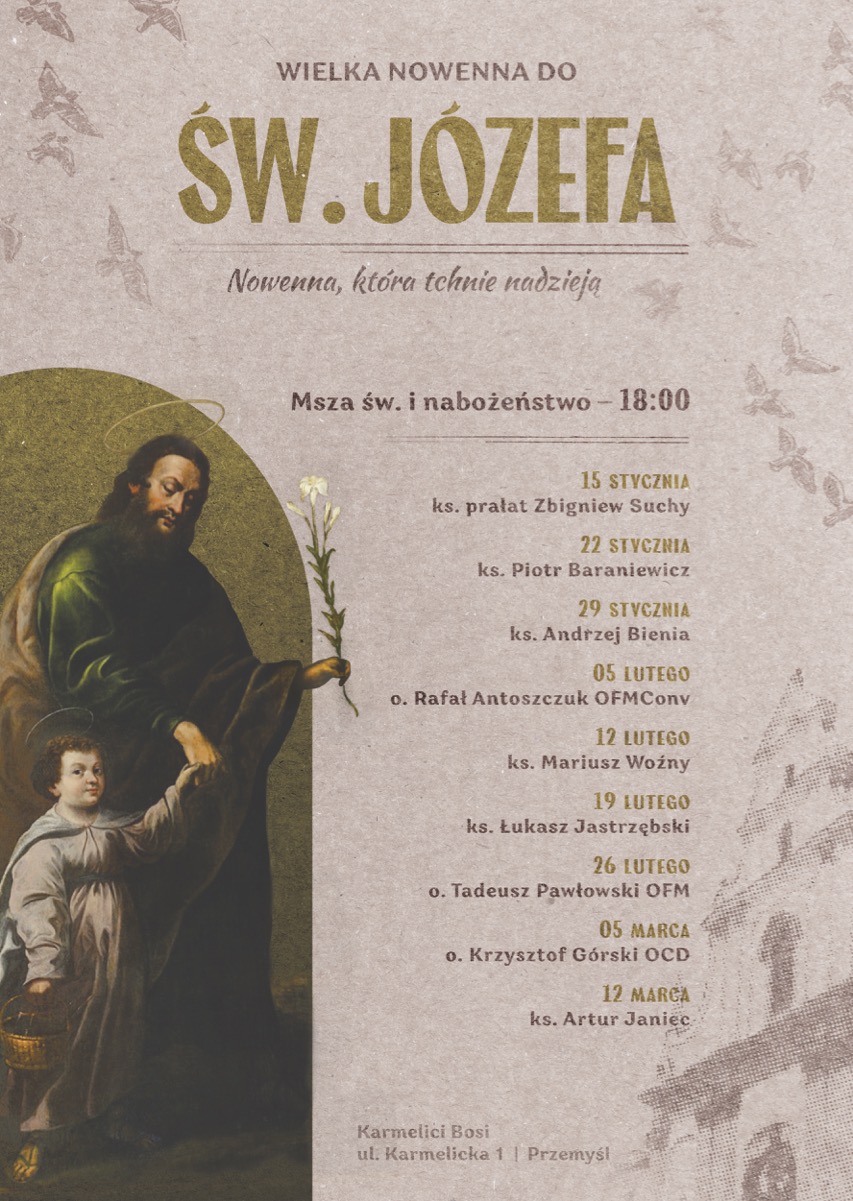Do udziału w Wielkiej Nowennie do św. Józefa wspólnota Karmelitów Bosych z Przemyśla zaprasza w każdą środę na godz. 18:00 podczas Mszy Świętej z homilią i modlitwą nowennową.