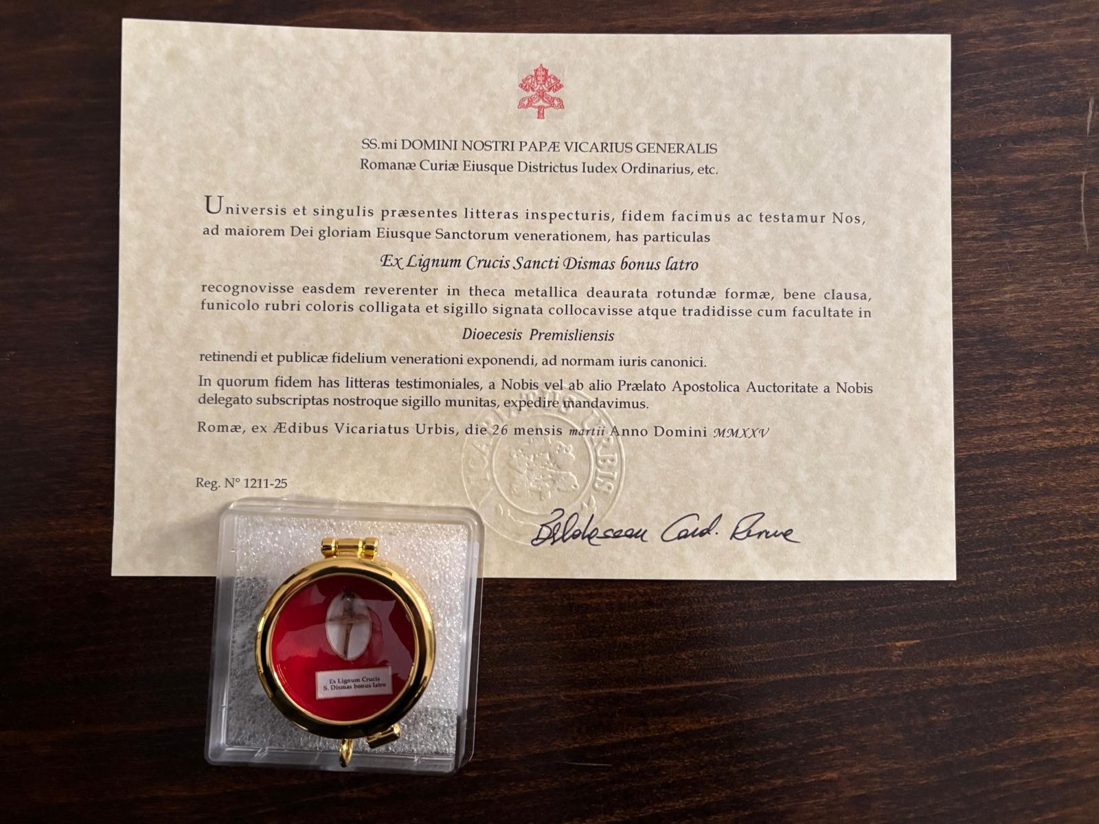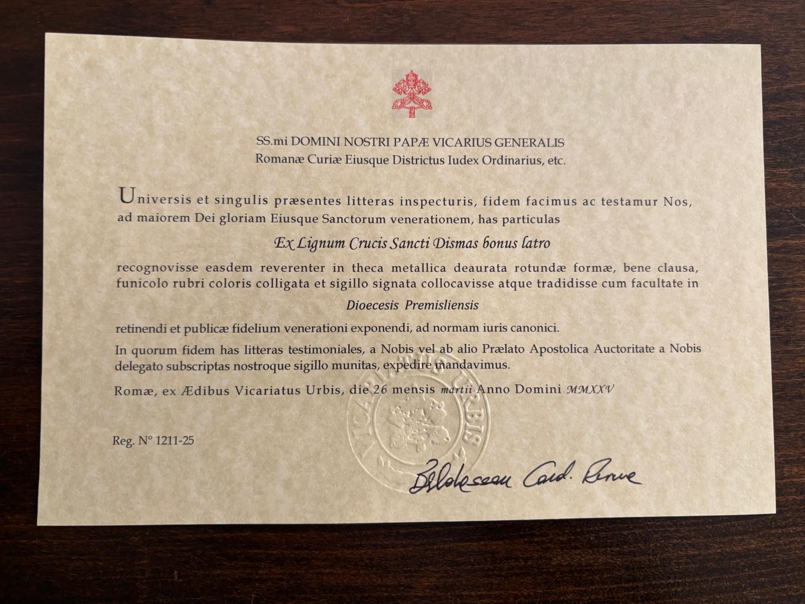 Przekazanie relikwii miało miejsce w budynku wikariatu diecezji rzymskiej. Tam kard. Baltazar Reina – wikariusz Ojca Świętego dla diecezji rzymskiej, przekazał relikwie drzewa krzyża św. Dobrego Łotra – patrona archidiecezji przemyskiej. Jak mówił abp Adam Szal – polecam opiece św. Dobrego Łotra naszych biskupów, kapłanów, Wyższe Seminarium Duchowne, wszystkie rodziny, chorych, cierpiących całą naszą archidiecezję, polecając się wstawiennictwo św. Dobrego Łotra, prosimy o jego opiekę i potrzebne łaski.