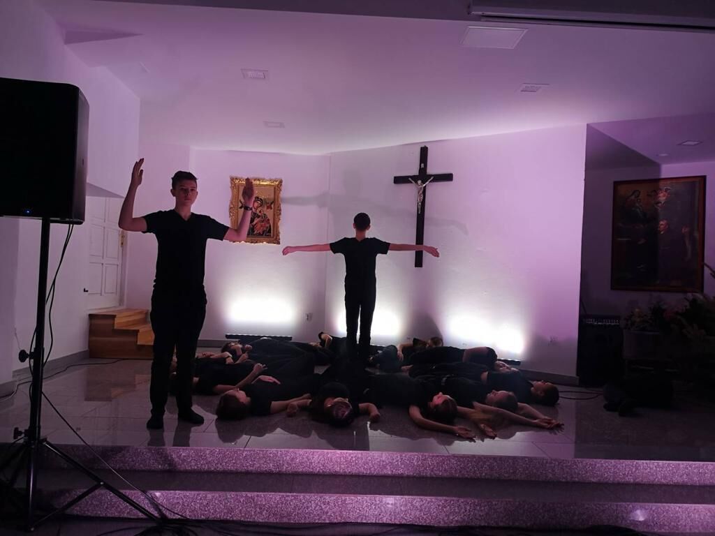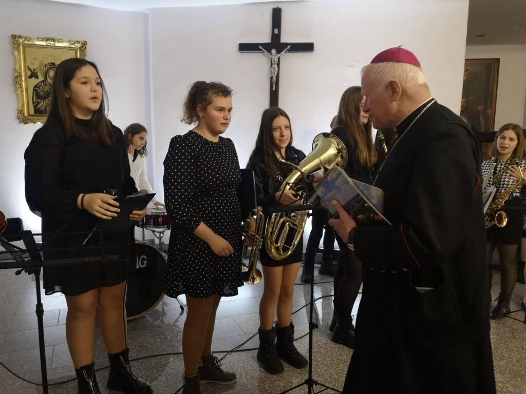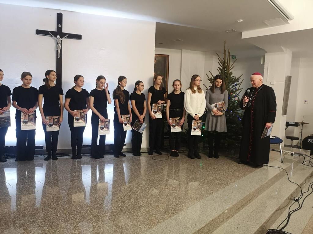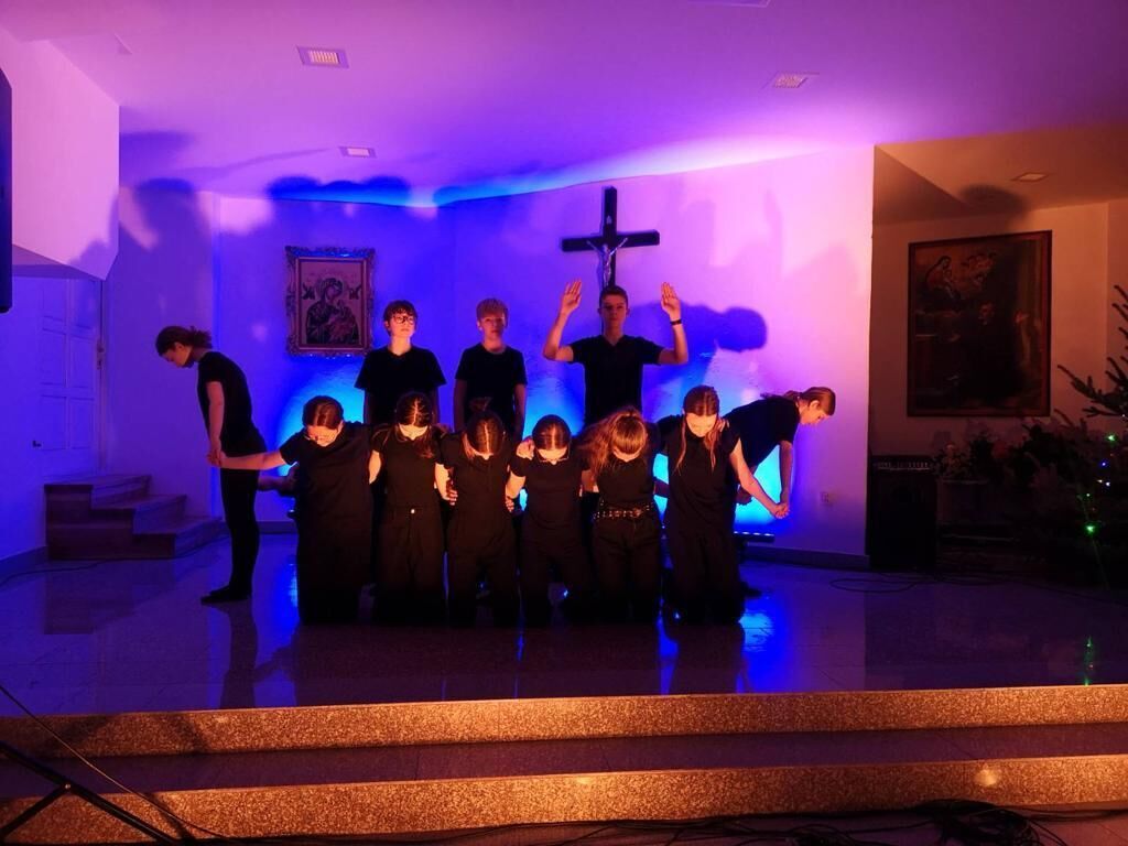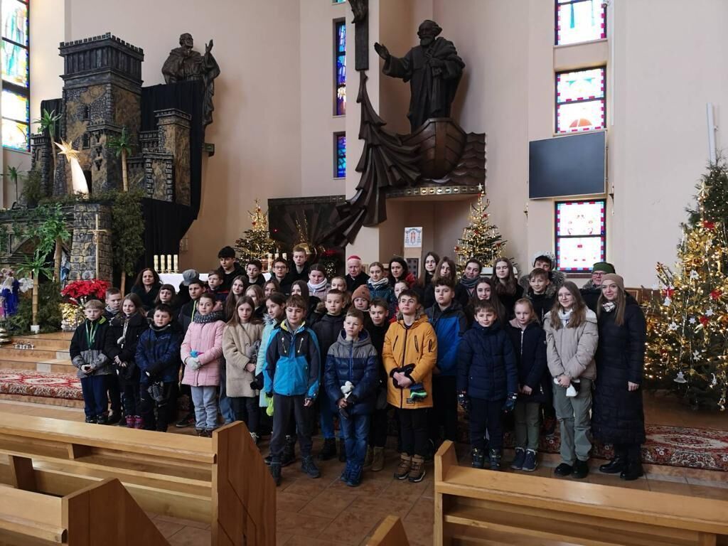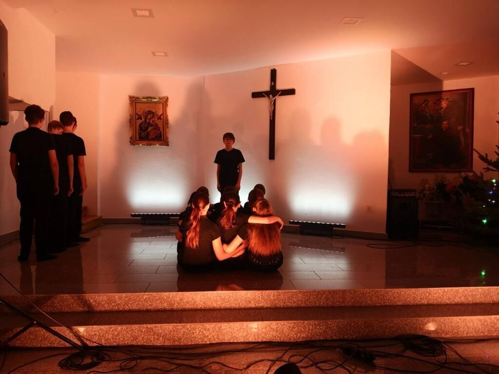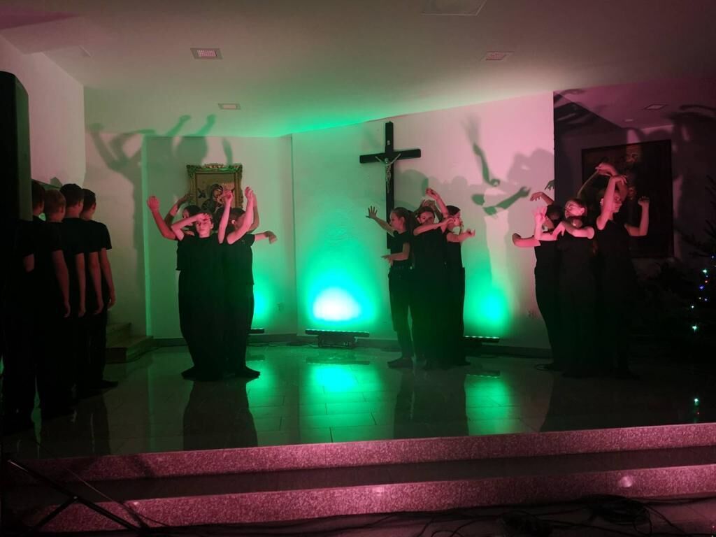 Spotkanie kolędowe Rodziny Szkół św. Jana Pawła II w Krośnie z występem kolędowym zespołu muzycznego ze szkoły w Krościenku Wyżnym i pantomimą wykonaną przez uczniów ze szkoły w Jasienicy Rosielnej