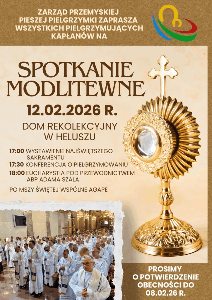 Zarząd Przemyskiej Pieszej Pielgrzymki zaprasza wszystkich kapłanów związanych z Przemyską Archidiecezjalną Pieszą Pielgrzymką na Jasną Górę na Spotkanie Modlitewne, które odbędzie się 12 lutego 2026 r., w Ośrodku rekolekcyjnym w Heluszu.