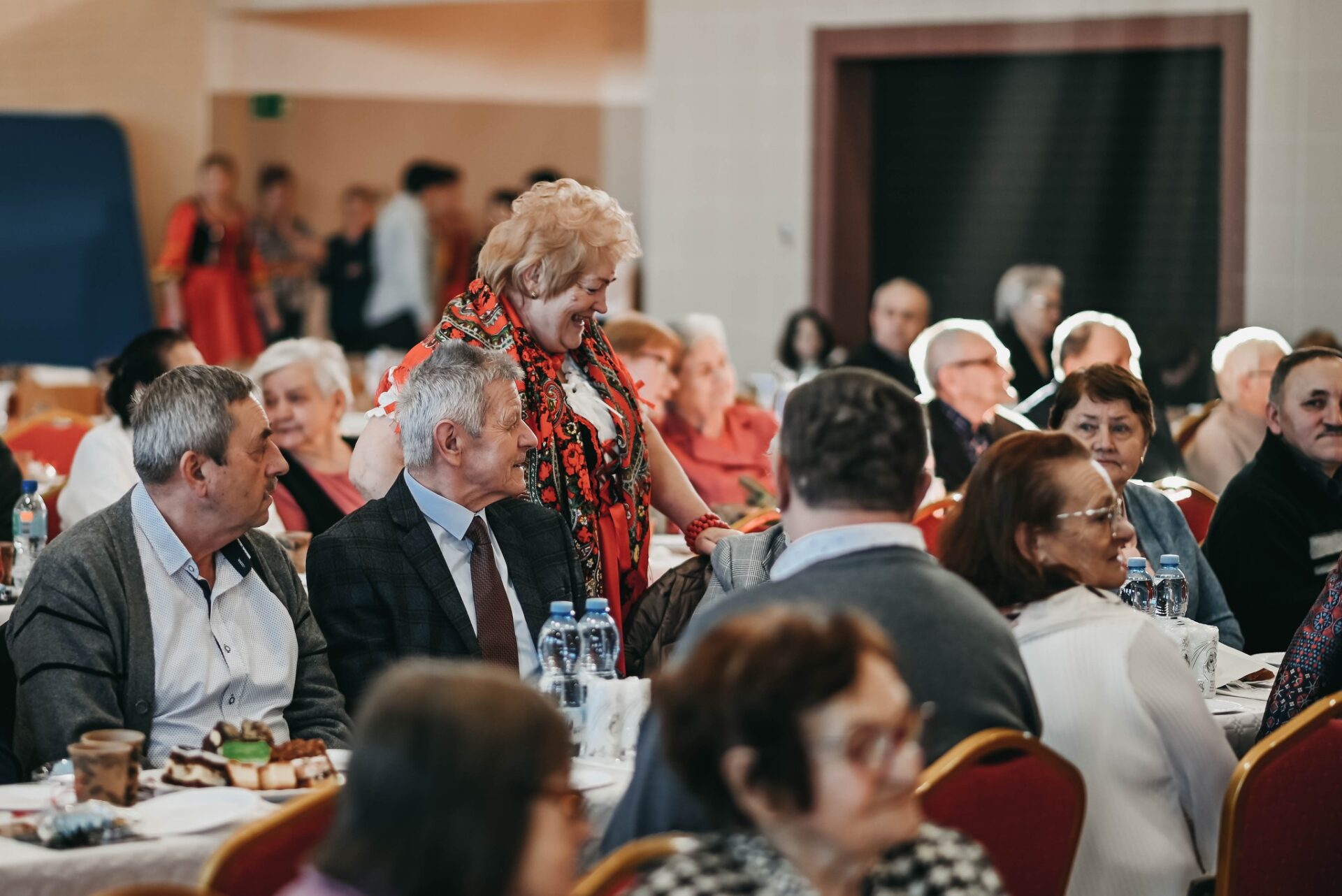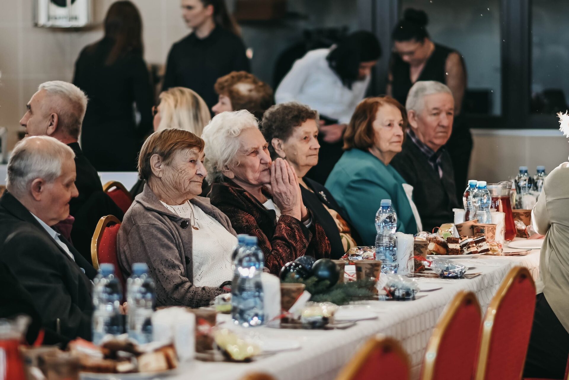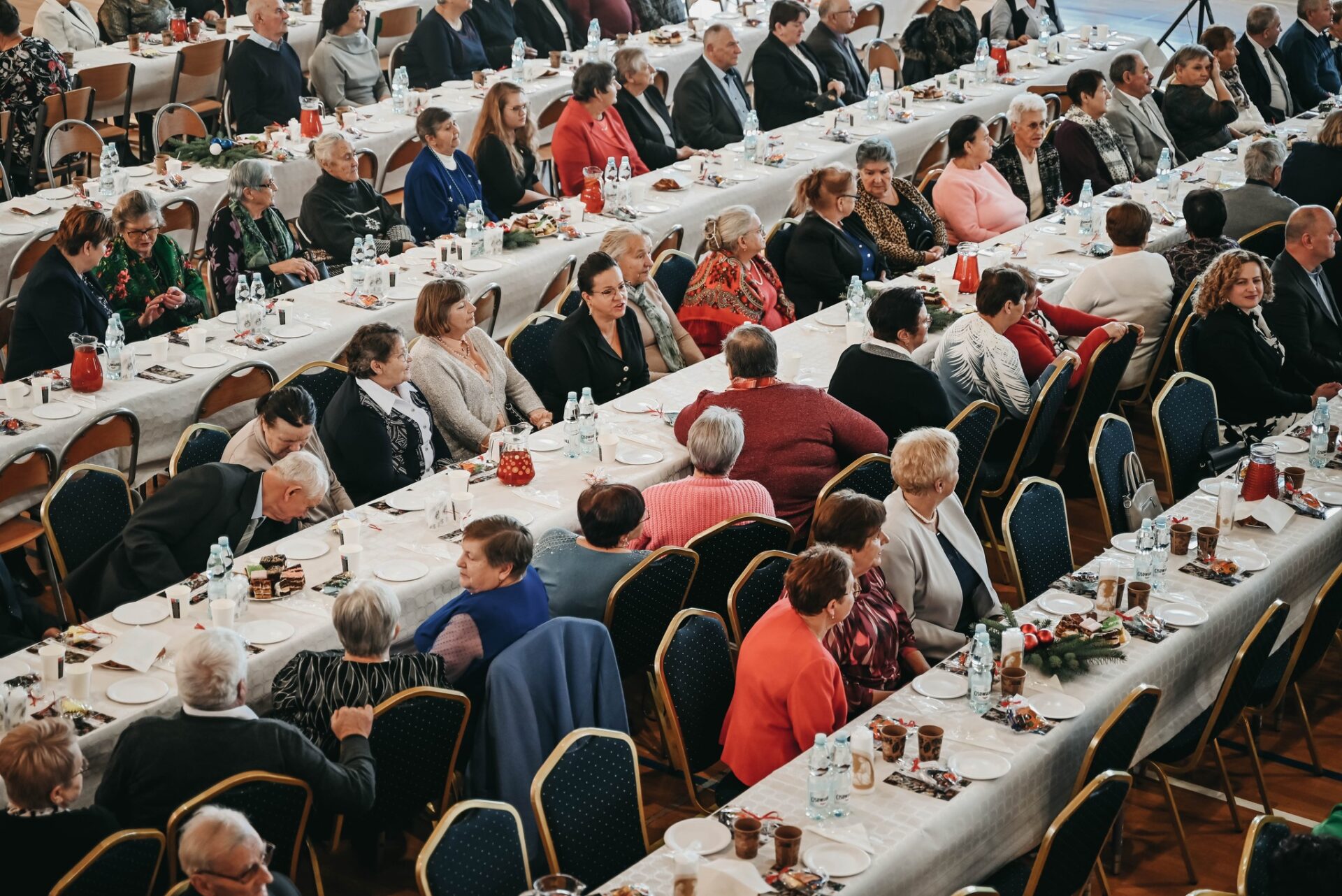 Wszyscy uczestnicy zasiedli do świątecznego stołu, na którym nie zabrakło tradycyjnych potraw wigilijnych i noworocznych specjałów. Seniorzy mogli spróbować barszczu czerwonego z uszkami, pierogów z kapustą i grzybami, a także różnorodnych słodkości, takich jak makowce, serniki czy pierniki. Dania przygotowali lokalni wolontariusze, którzy z zaangażowaniem dbali o najmniejszy szczegół spotkania. W czasie wspólnego posiłku rozmowy przy stołach nabrały jeszcze bardziej rodzinnego charakteru. Seniorzy dzielili się swoimi wspomnieniami, anegdotami oraz refleksjami dotyczącymi świąt i nowego roku.