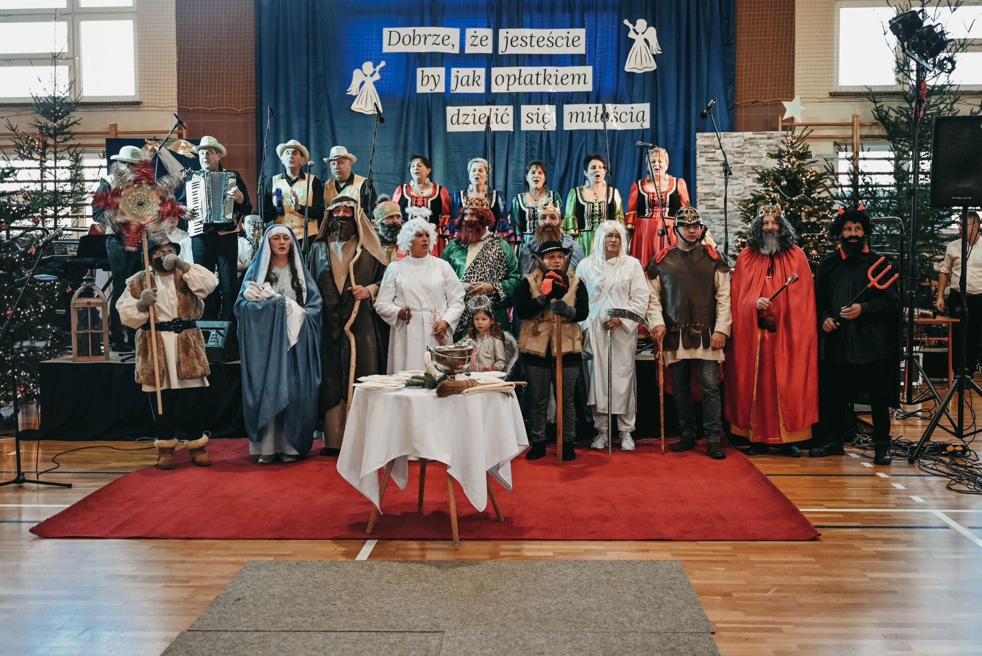 Wzruszającym punktem programu był bożonarodzeniowy spektakl słowno-muzyczny w wykonaniu dzieci ze Szkoły Podstawowej w Tryńczy. Mali aktorzy, przygotowani przez nauczycieli oraz rodziców, zaprezentowali historię narodzin Jezusa w niezwykle wzruszający i barwny sposób. Kolorowe stroje pasterzy, aniołów oraz Trzech Króli, a także naturalna radość i zaangażowanie dzieci, stworzyły niezapomnianą atmosferę. Publiczność śledziła spektakl z ogromnym zainteresowaniem, doceniając nie tylko talent młodych artystów, ale także ich staranność w oddaniu szczegółów biblijnej opowieści. W czasie spotkania nie zabrakło także występów miejscowych zespołów ludowych, którzy inicjowali wspólny śpiew kolęd i pastorałek.