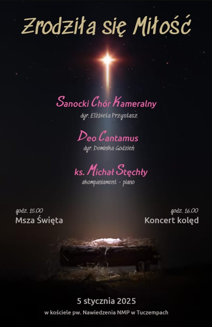W niedziele, 5 stycznia 2025 r., w Tuczempach odbędzie się świąteczny koncert kolęd pt. „Zrodziła się Miłość”. To wydarzenie, na którym będzie można usłyszeć najpiękniejsze polskie kolędy i pastorałki, zarówno te znane, jak i mniej znane.
