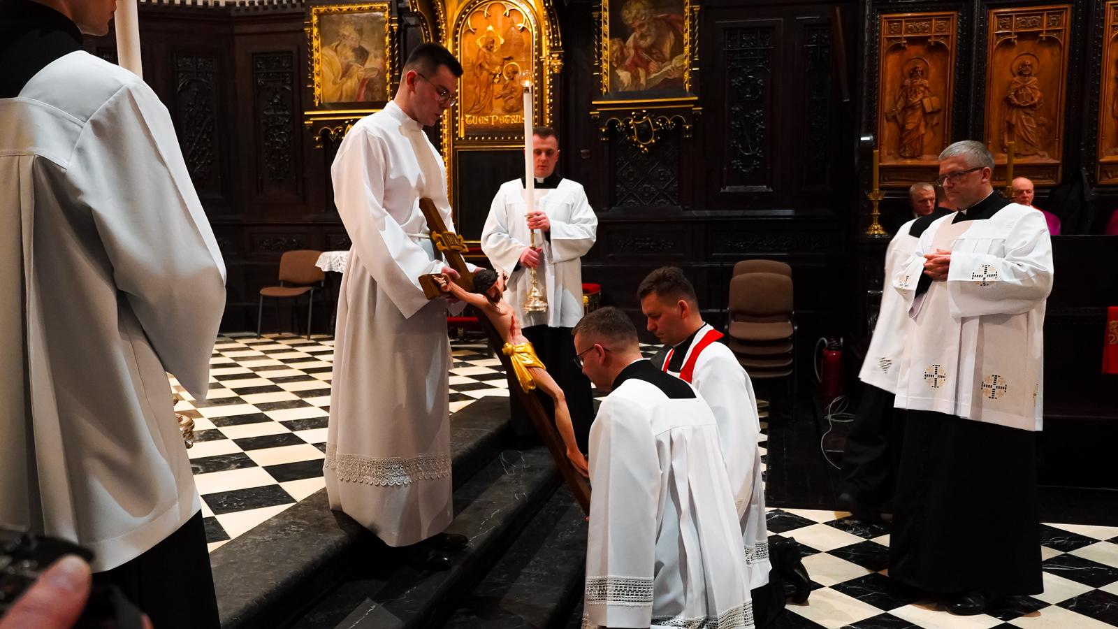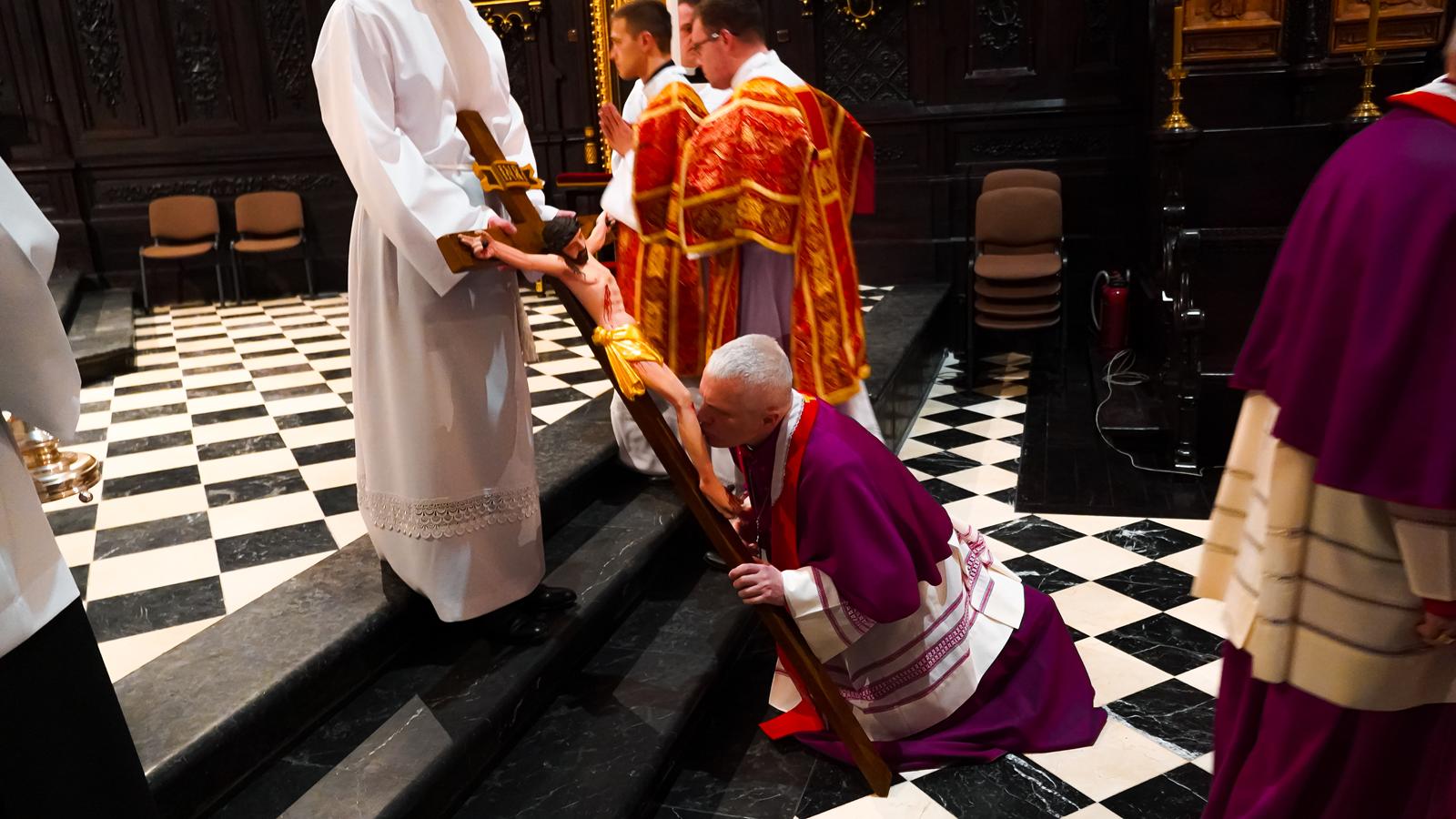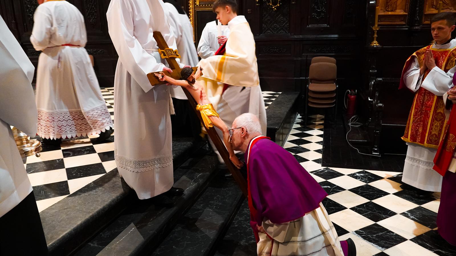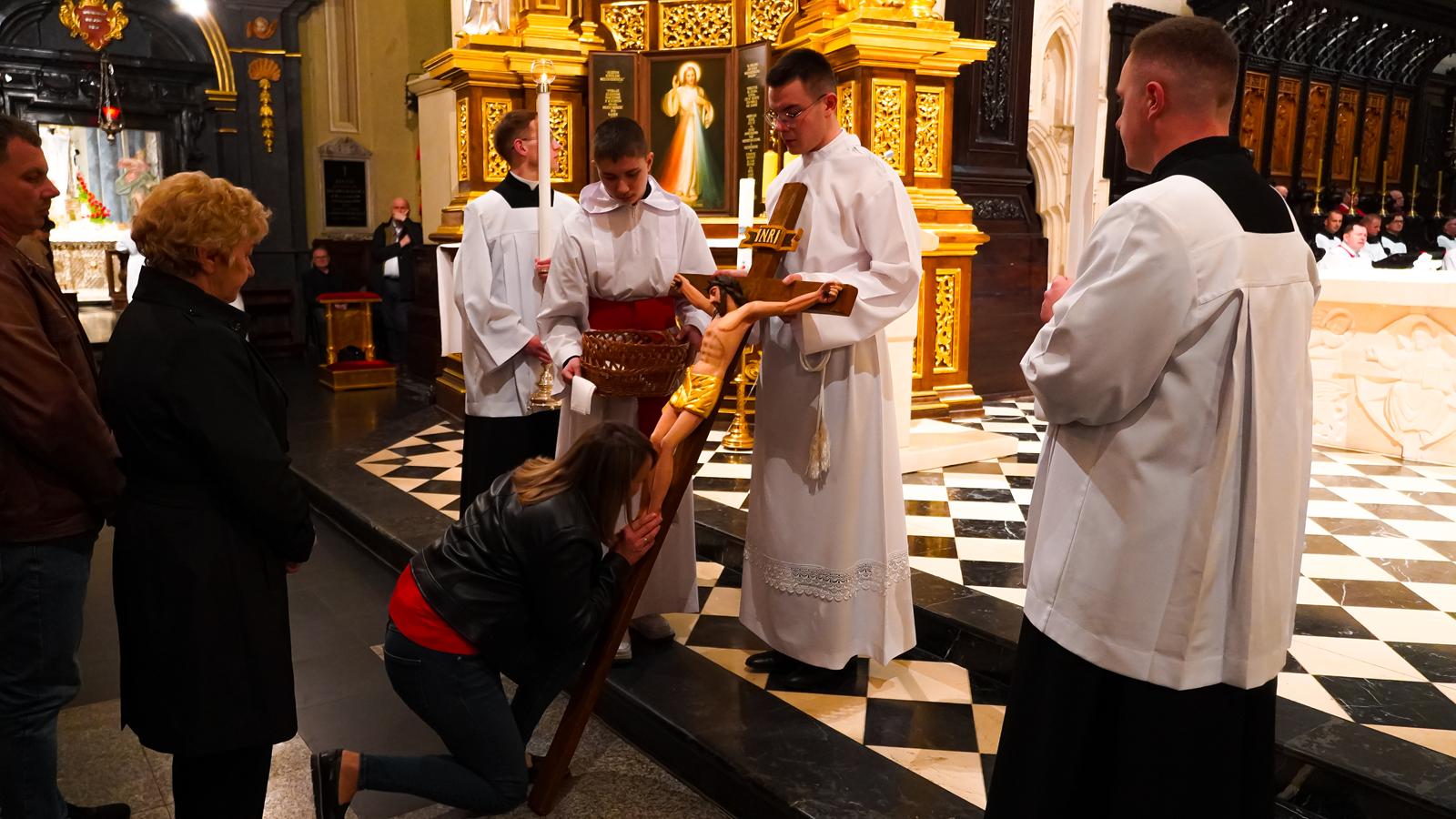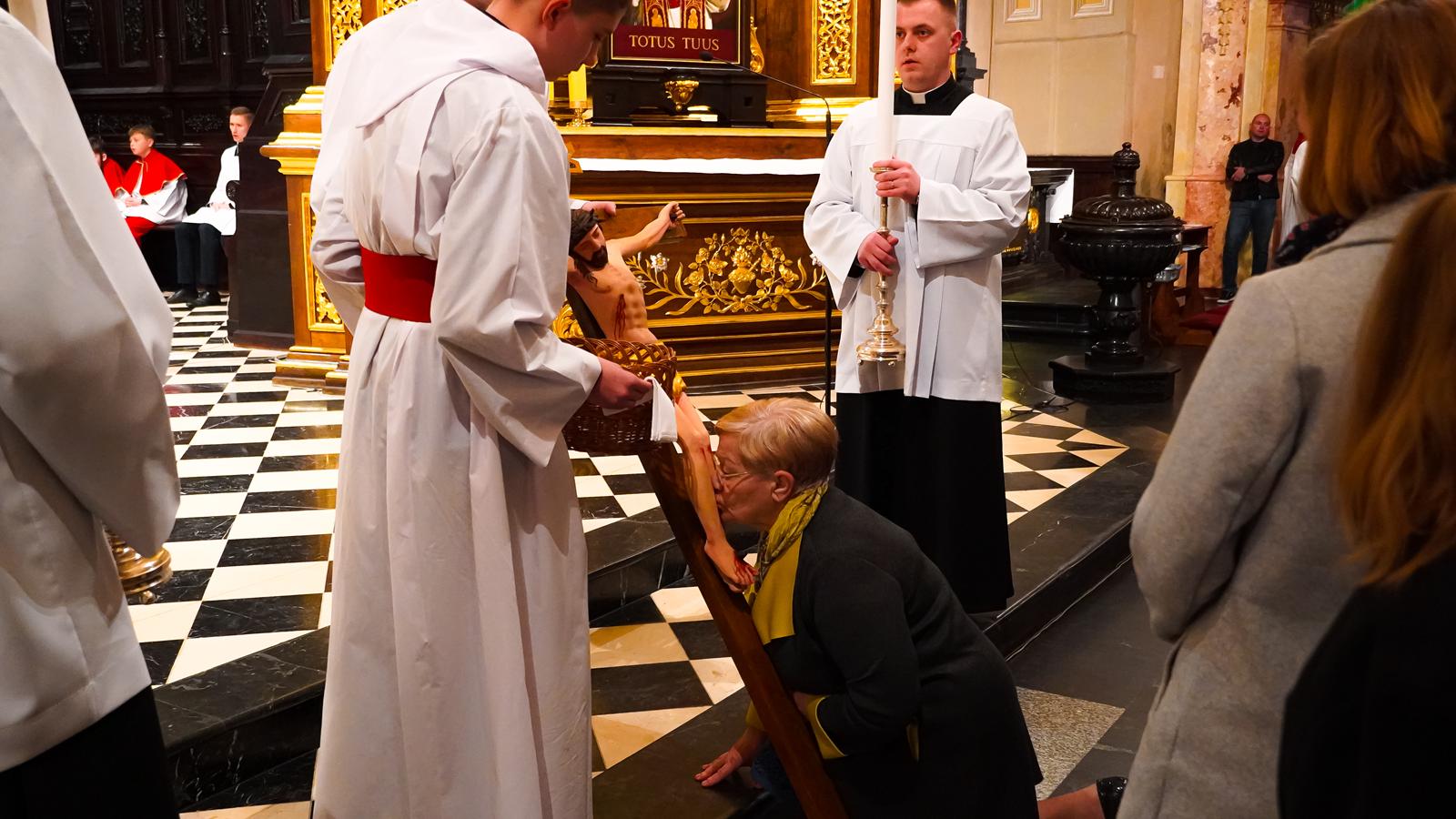 Centralnym wydarzeniem liturgii wielkopiątkowej była adoracja krzyża. Zasłonięty jubileuszowy krzyż wniesiono przed ołtarz. Arcybiskup stopniowo odsłaniał ramiona krzyża i śpiewał trzykrotnie: „Oto drzewo Krzyża, na którym zawisło zbawienie świata”, na co wierni odpowiadali: „Pójdźmy z pokłonem”. Następnie wszyscy adorowali krzyż. Po adoracji krzyża z ciemnicy przyniesiono Najświętszy Sakrament i wierni przyjęli Komunię świętą.