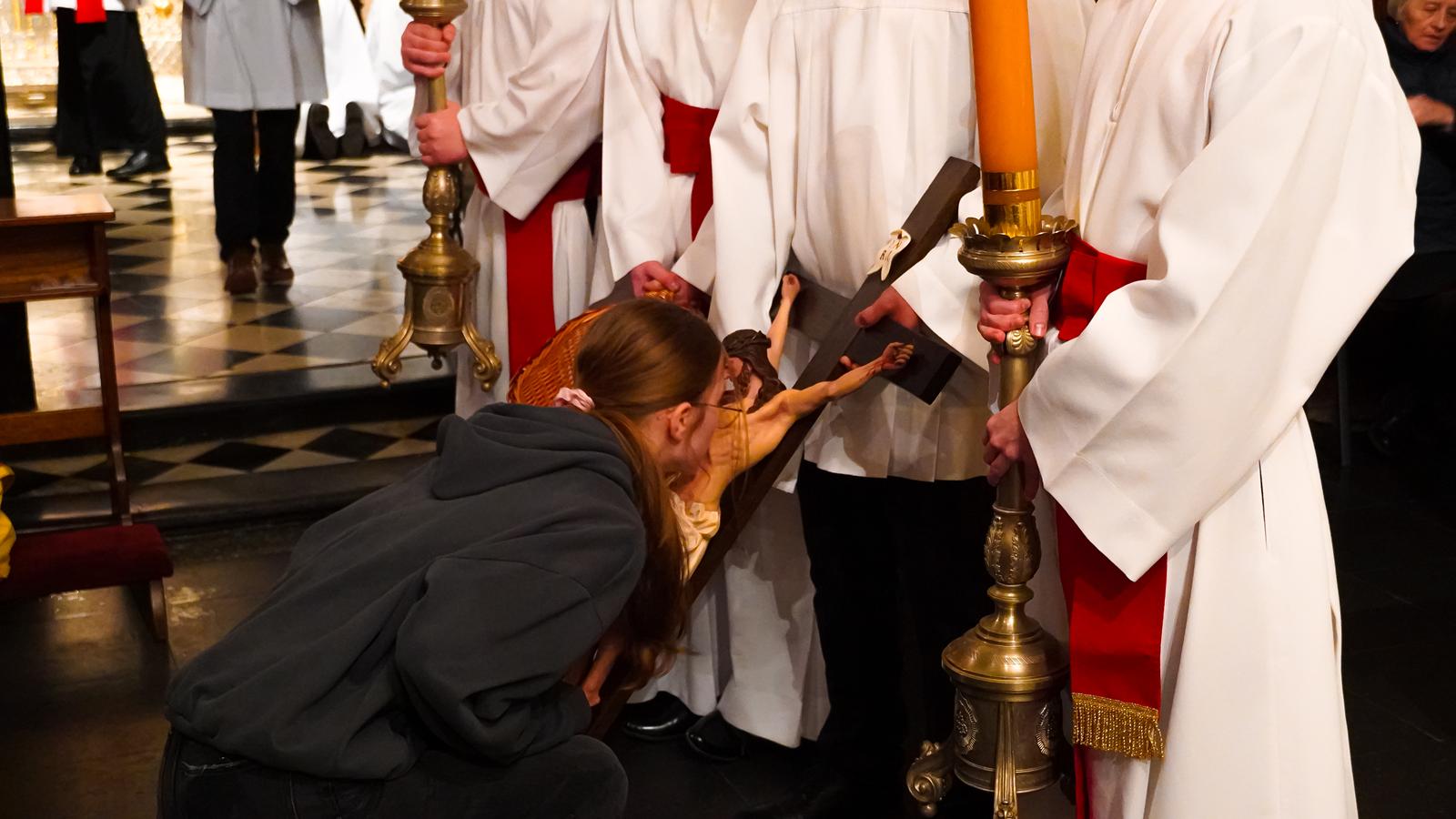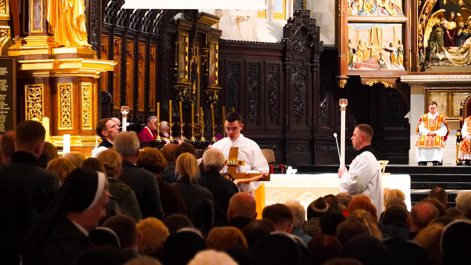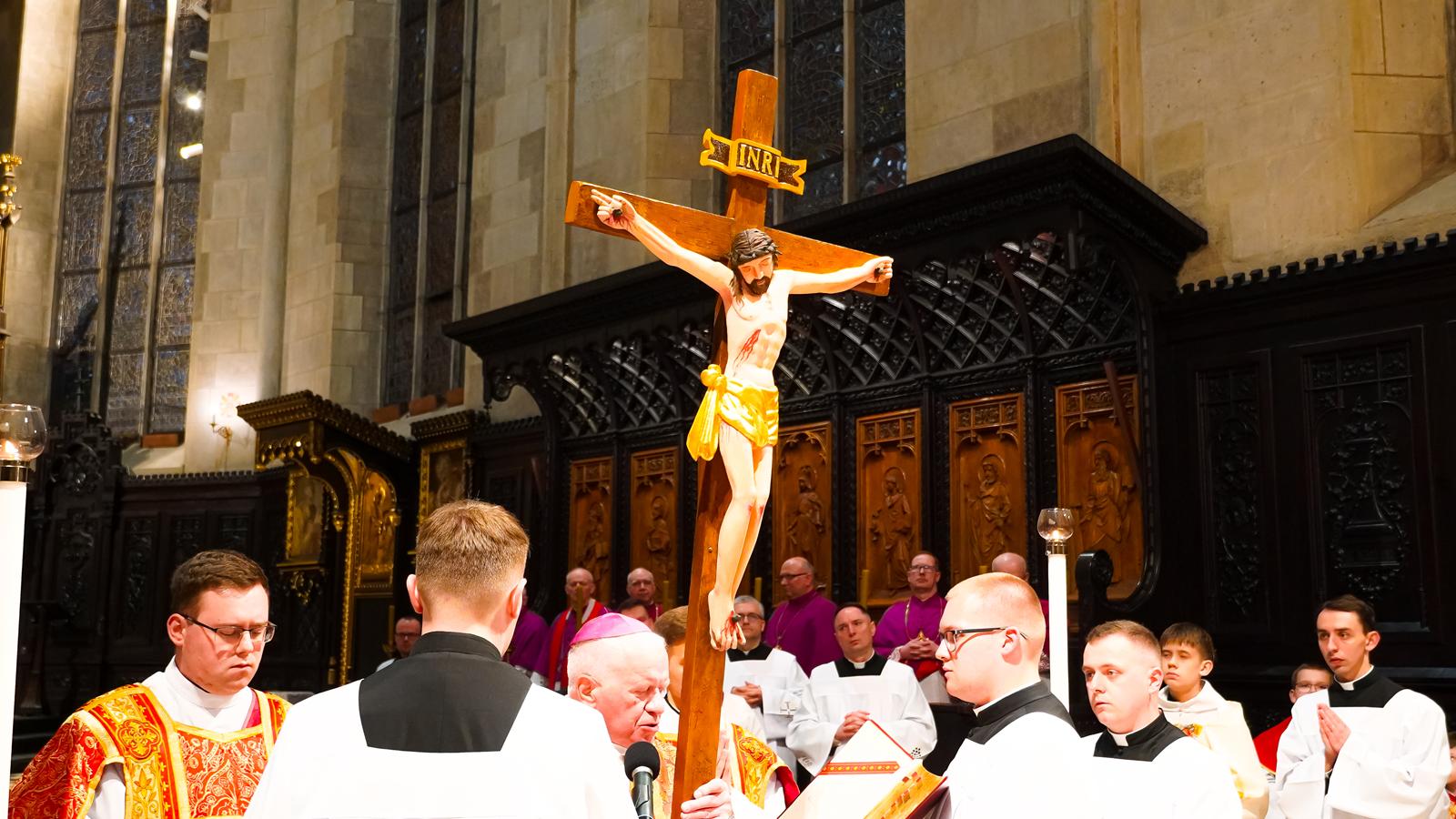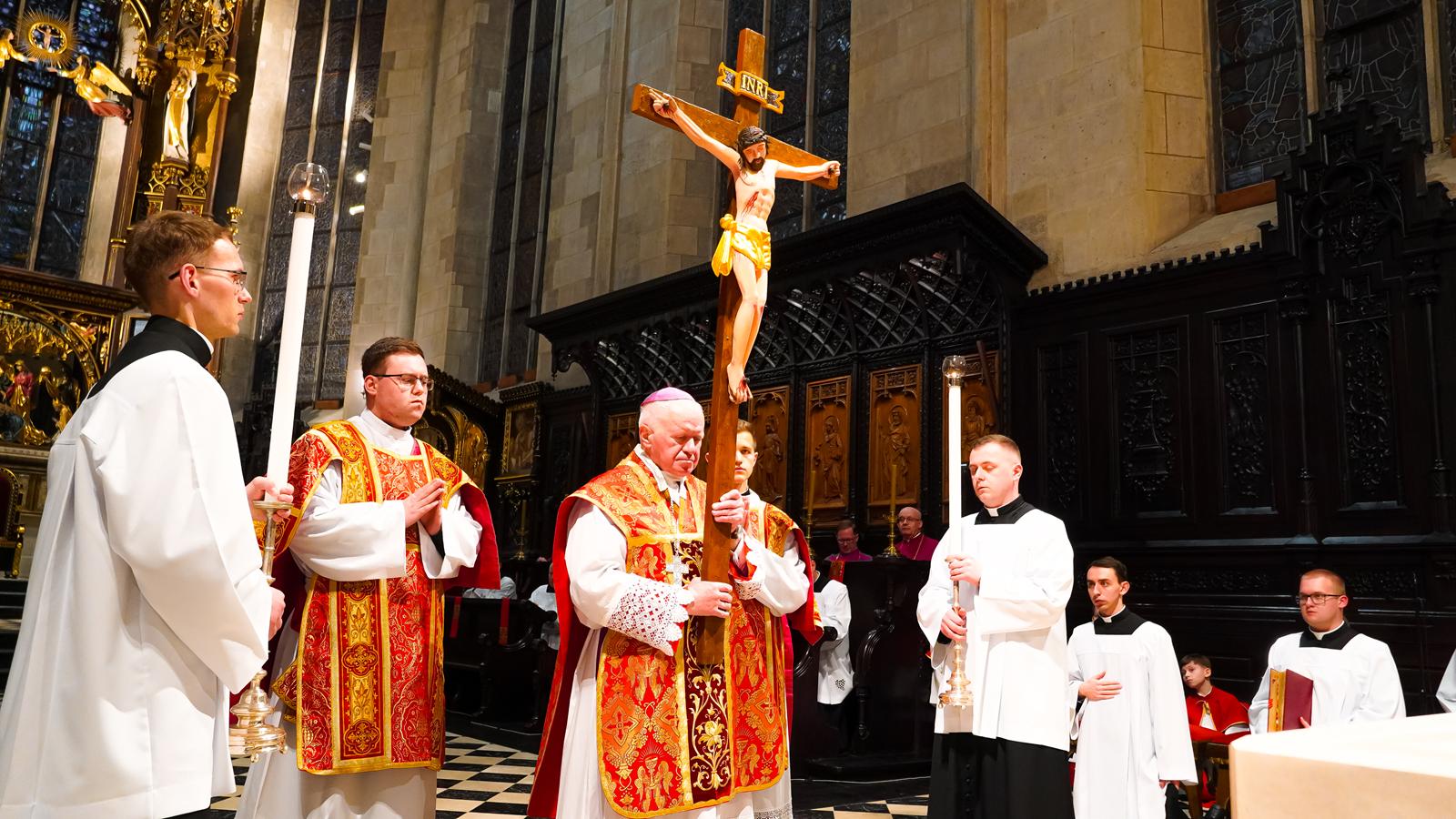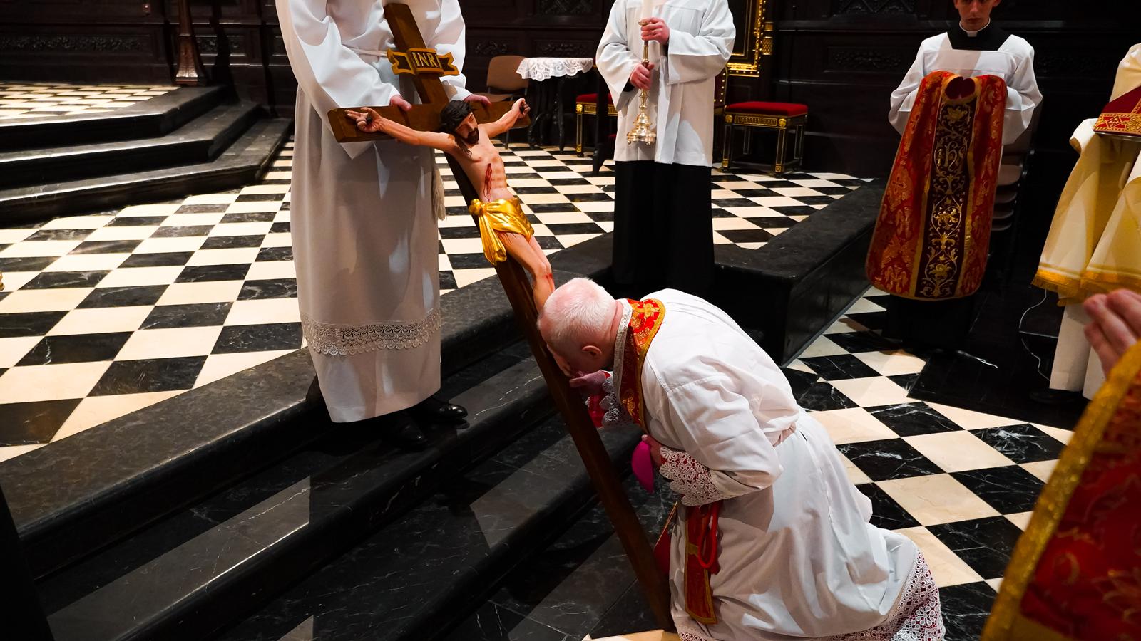 Centralnym wydarzeniem liturgii wielkopiątkowej była adoracja krzyża. Zasłonięty jubileuszowy krzyż wniesiono przed ołtarz. Arcybiskup stopniowo odsłaniał ramiona krzyża i śpiewał trzykrotnie: „Oto drzewo Krzyża, na którym zawisło zbawienie świata”, na co wierni odpowiadali: „Pójdźmy z pokłonem”. Następnie wszyscy adorowali krzyż. Po adoracji krzyża z ciemnicy przyniesiono Najświętszy Sakrament i wierni przyjęli Komunię świętą.