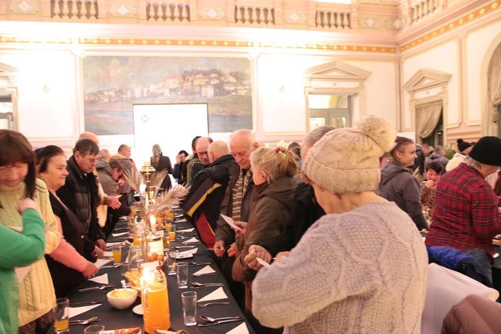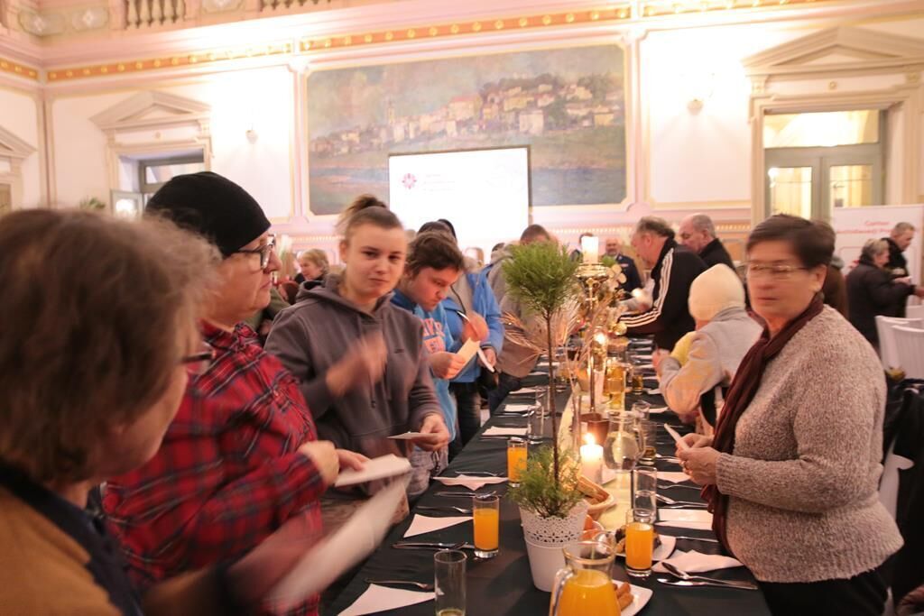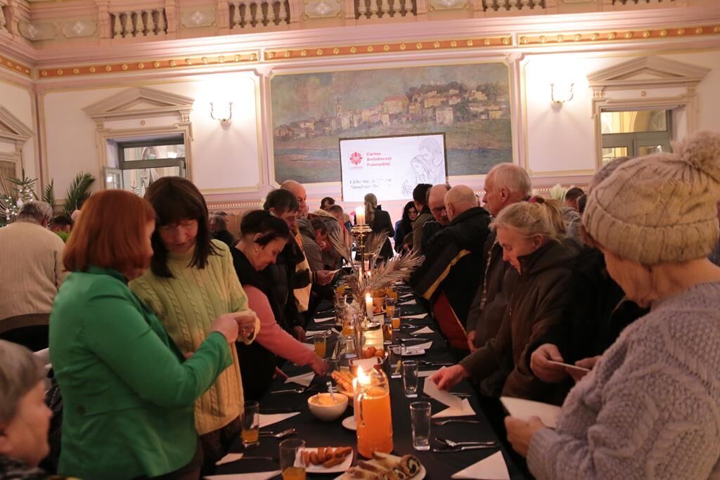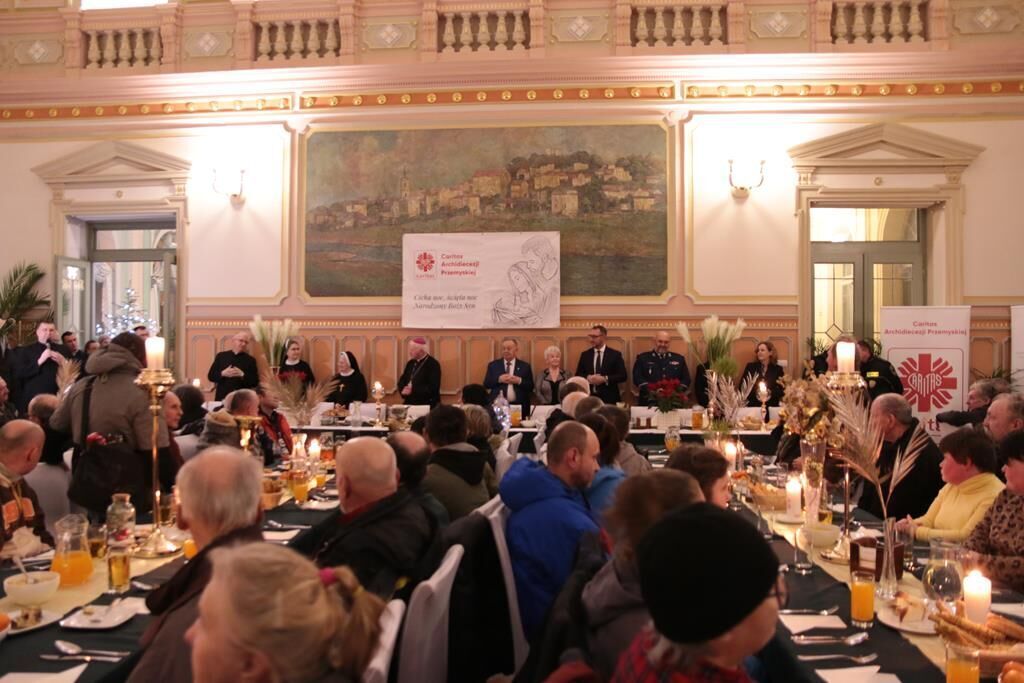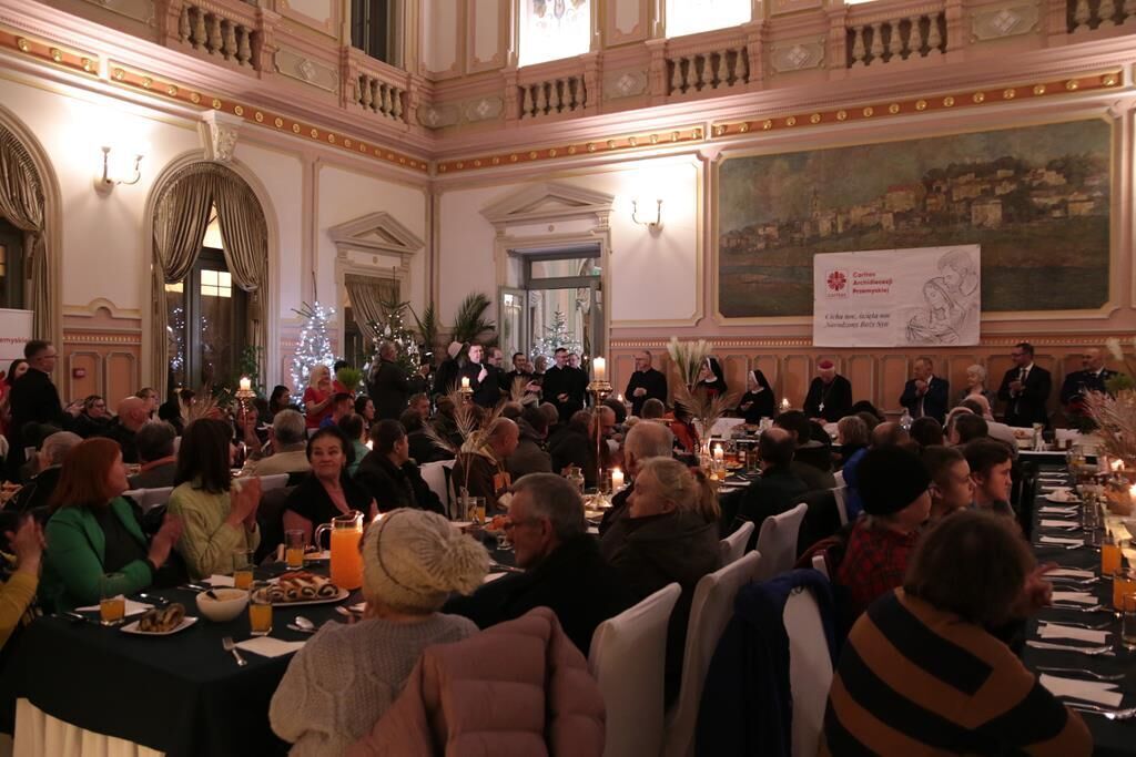 Po modlitwie i życzeniach wszyscy zasiedli do stołów. Dla potrzebujących przygotowano typowe potrawy wigilijne: barszcz z uszkami, pierogi, kapustę z grochem, rybę oraz słodkości. W spotkaniu w Przemyślu wzięło udział około 300 osób. Każdy uczestnik spotkania otrzymał także paczkę żywnościową. Łącznie w ostatnich dniach przemyska Caritas przekazała dla potrzebujących na terenie naszej archidiecezji 2000 paczek z żywnością długoterminową.