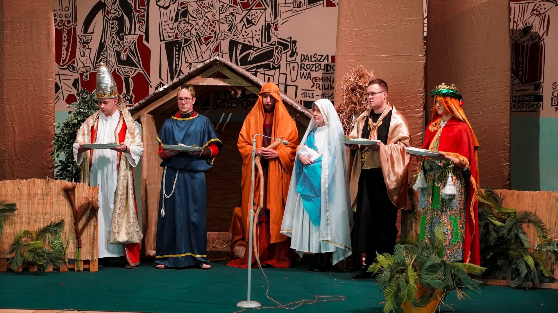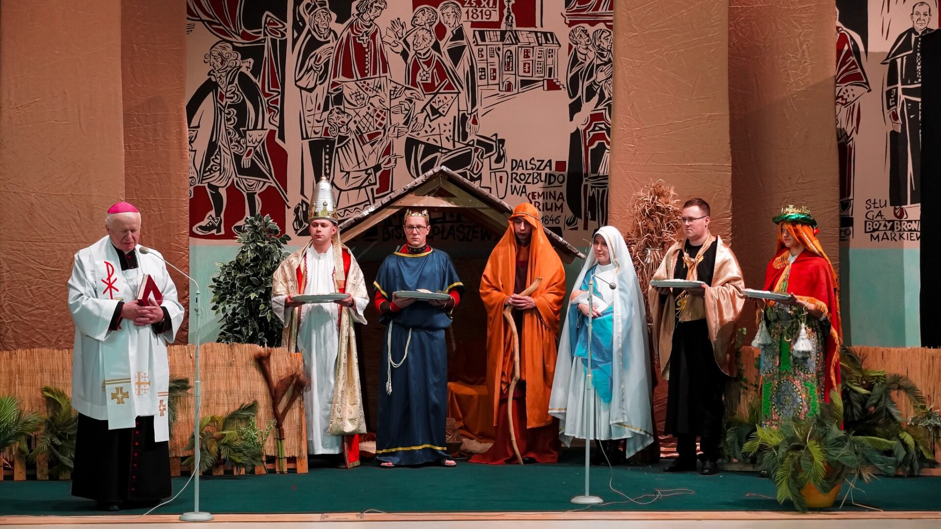 Wieczór wigilijny rozpoczął się jasełkami w wykonaniu najstarszych alumnów. Diakoni przedstawili historię Bożego Narodzenia przez pryzmat legendy o czwartym królu. Dary jakie miał ofiarować nowonarodzonemu Zbawicielowi oddał, aby pomagać innym. Kiedy stanął przed Dzieciątkiem Jezus z pustymi rękami usłyszał, że jego miłosierdzie jest największym darem jaki mógł ofiarować nowonarodzonemu Królowi.