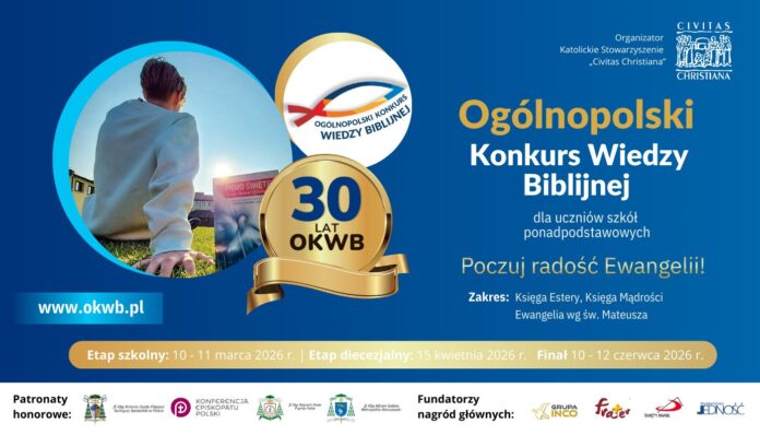 Katolickie Stowarzyszenie „Civitas Christiana” serdecznie zaprasza uczniów szkół ponadpodstawowych do udziału w jubileuszowej, 30. edycji Ogólnopolskiego Konkursu Wiedzy Biblijnej.