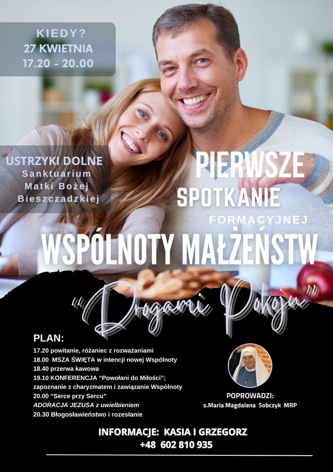 Powstająca „Wspólnoty małżeństw” w Ustrzykach Dolnych/Jasieniu zaprasza na pierwsze spotkanie organizacyjne, które odbędzie się w poniedziałek, 27 kwietnia 2026 w godz. 17:20-20:00 w sanktuarium Matki Bożej Bieszczadzkiej w Ustrzykach Dolnych / Jasieniu.