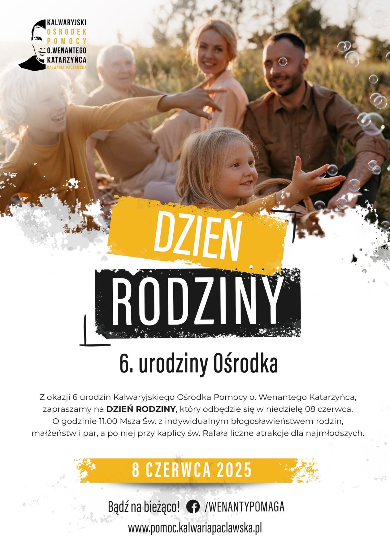 Kalwaryjski Ośrodek Pomocy o. Wenantego Katarzyńca zaprasza na Dzień Rodziny połączony z 6. rocznicą powołania Ośrodka. Dzień Rodziny odbędzie się w niedzielę, 08 czerwca 2025 r., w sanktuarium Męki Pańskiej i Matki Bożej w Kalwarii Pacławskiej.