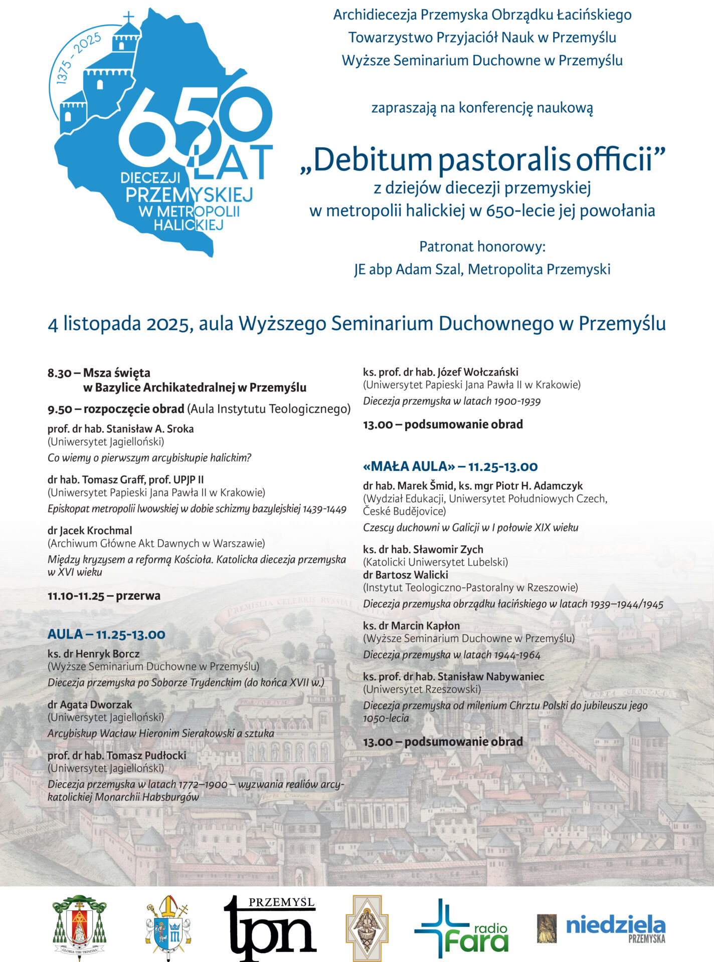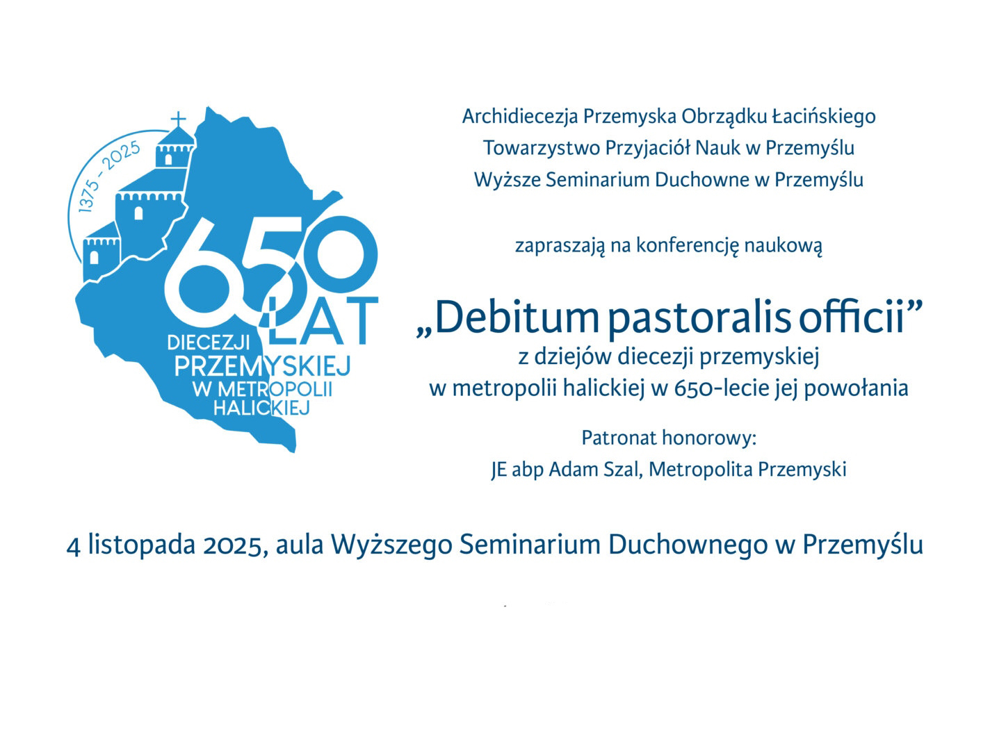 Archidiecezja Przemyska Obrządku Łacińskiego, Towarzystwo Przyjaciół Nauk w Przemyślu i Wyższe Seminarium Duchowne w Przemyślu zapraszają na konferencję naukową „Debitum pastoralis officii” z dziejów diecezji przemyskiej w metropolii halickiej w 650-lecie jej powstania.