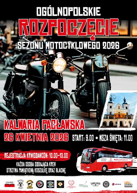 Ojcowie Franciszkanie Konwentualni z Kalwarii Pacławskiej serdecznie zapraszają w niedzielę, 26 kwietnia 2026 r., na Ogólnopolskie Rozpoczęcie Sezonu Motocyklowego 2026, które rozpocznie uroczysta Msza święta na galerii o godz. 11.00 z błogosławieństwem kierowców i jednośladów.