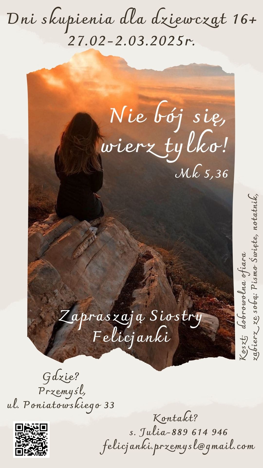 Zgromadzenie Sióstr Felicjanek serdecznie zaprasza dziewczęta powyżej 16 r.ż. na dni skupienia Domu Zakonnym przy ul. Poniatowskiego 33 w Przemyślu. Rekolekcje zaplanowano w dniach 27.02 – 02.03.2025 r.